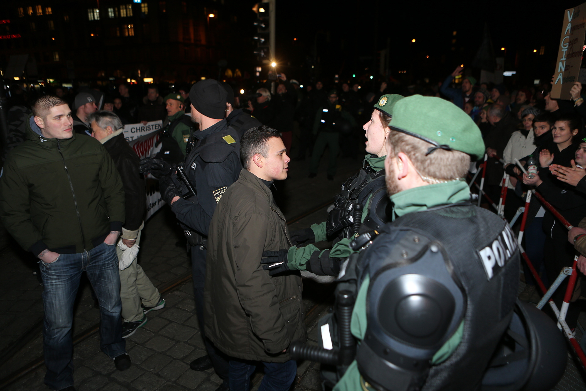Die Pegida-Teilnehmer starteten ihren „Spaziergang“ am Sendlinger Tor mit einer Kundgebung und marschierten daraufhin 500 Meter in Richtung Karlsplatz, Stachus. Die aufgeheizte Stimmung war bereits zu diesem frühen Zeitpunkt zu erkennen, am Sendlinger Tor waren Provokationen von beiden Seiten zu sehen.