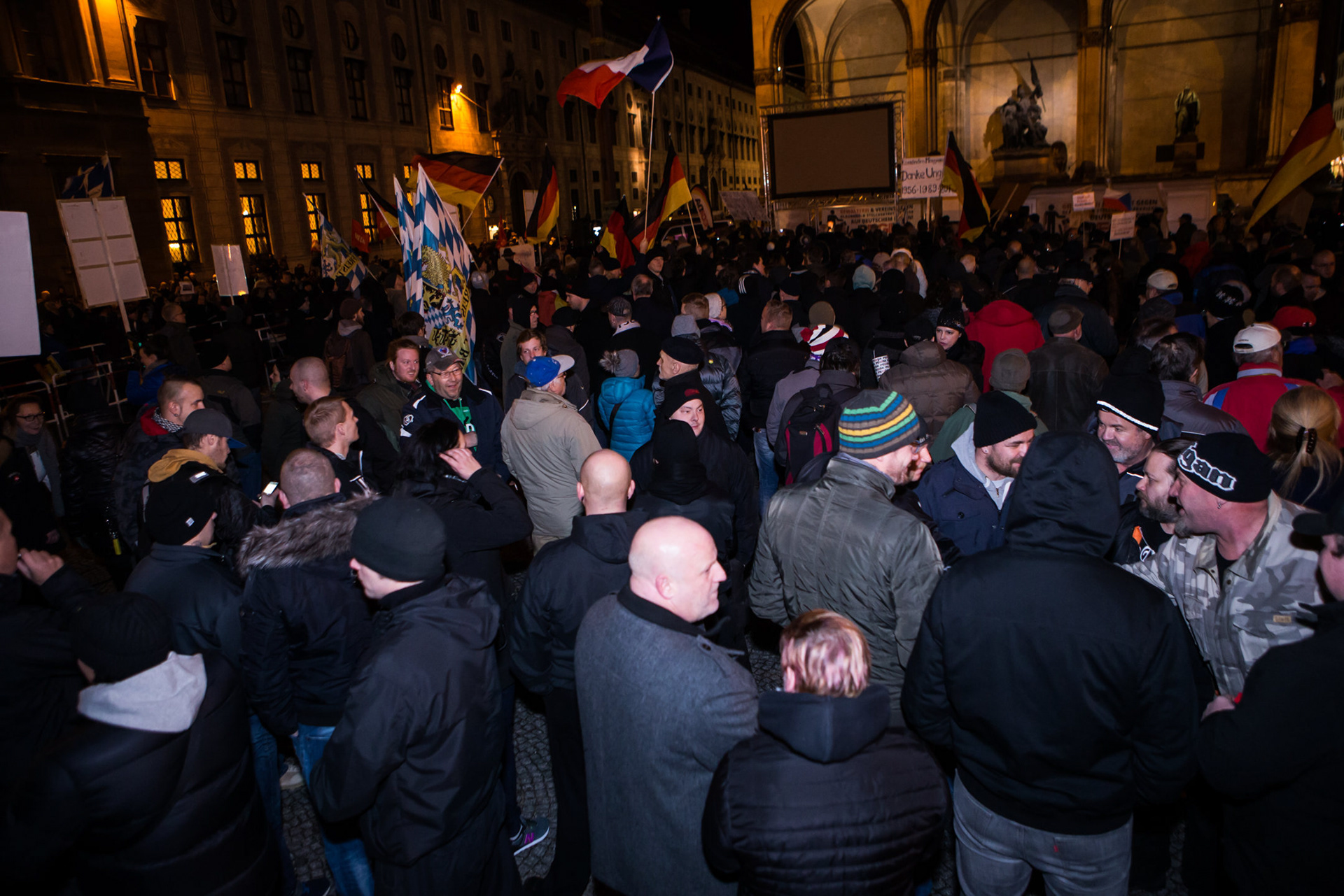 Zuspruch erhielt Pegida wie das ganze letzte Jahr über wieder aus der organisierten Neonazi-Szene. So nahm der Landesvorsitzende der Partei Die Rechte, Philipp Hasselbach, am Marsch teil. Er hatte vor wenigen Wochen den Vorsitz des Münchner Kreisverbandes, den er an Hitlers Geburtstag 2014 gegründet hatte, an Victoria Grasser abgegeben, die sich ebenfalls einfand, wie ihr Stellvertreter Tobias Roidl. Der war im Dezember der Münchner Bild-Zeitung als Mitarbeiter der Stadtsparkasse aufgefallen und wurde nach den Enthüllungen von seinem Arbeitgeber beurlaubt. Vom Nürnberger Kreisverband der Kleinstpartei fand sich Dan Eising mit einer kleinen Gruppe Gleichgesinnter ein.