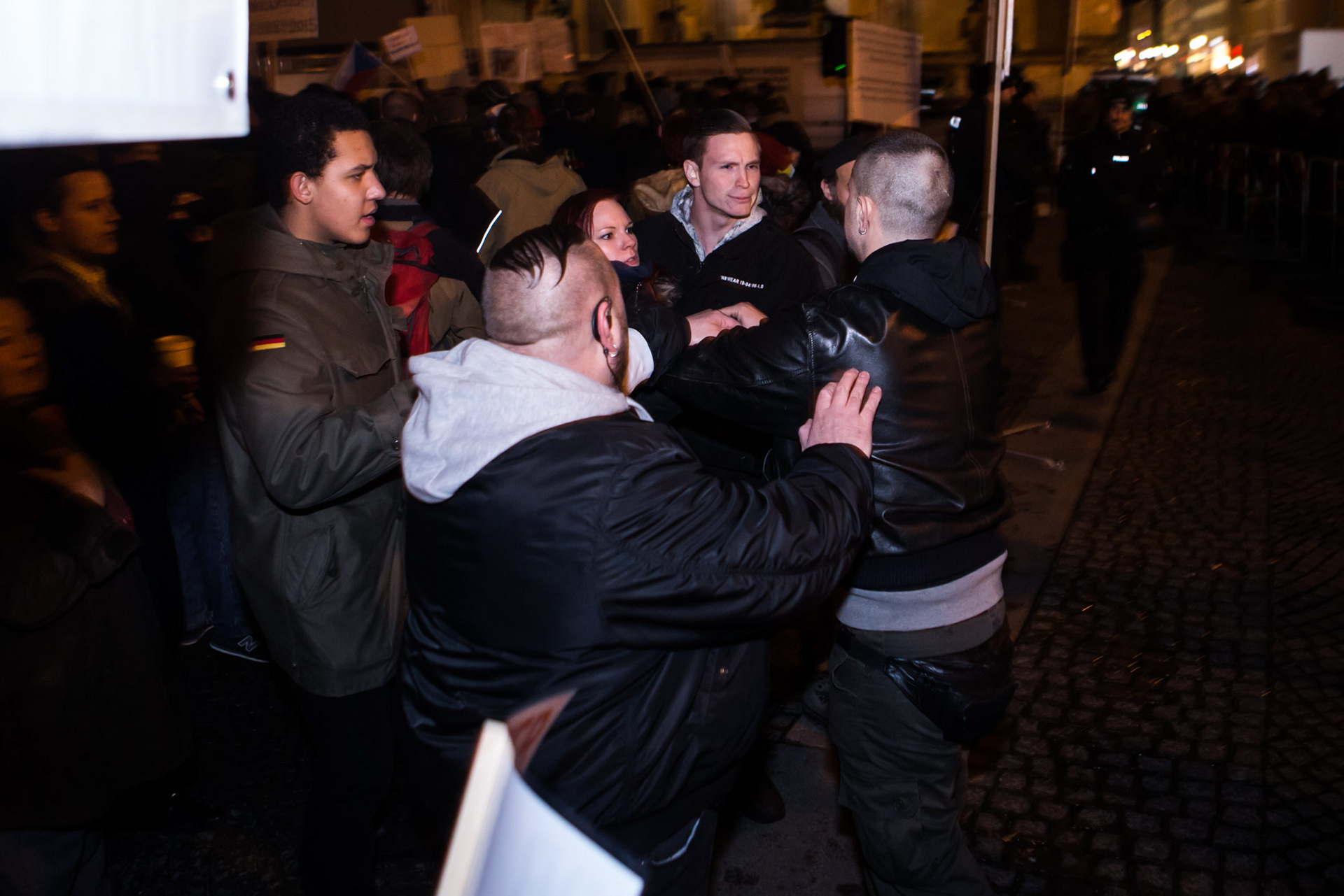 Zu einem Zwischenfall innerhalb der Absperrung kam es gleich zu Beginn der Versammlung. Rolf H., bekannter Aktivist der islamfeindlichen Partei Die Freiheit und bei Pegida für die Pressebehinderung zuständig, hielt Medienvertretern, Polizei, Gegendemonstranten und Pegida-Anhängern ein Smartphone mit eingeschalteter Taschenlampe direkt vors Gesicht. Ein Pegida-Unterstützer fühlte sich dadurch wohl provoziert und attackierte H., geriet im Anschluss auch noch mit Kadern der Rechten aneinander und wurde von der Polizei letztlich abgeführt.