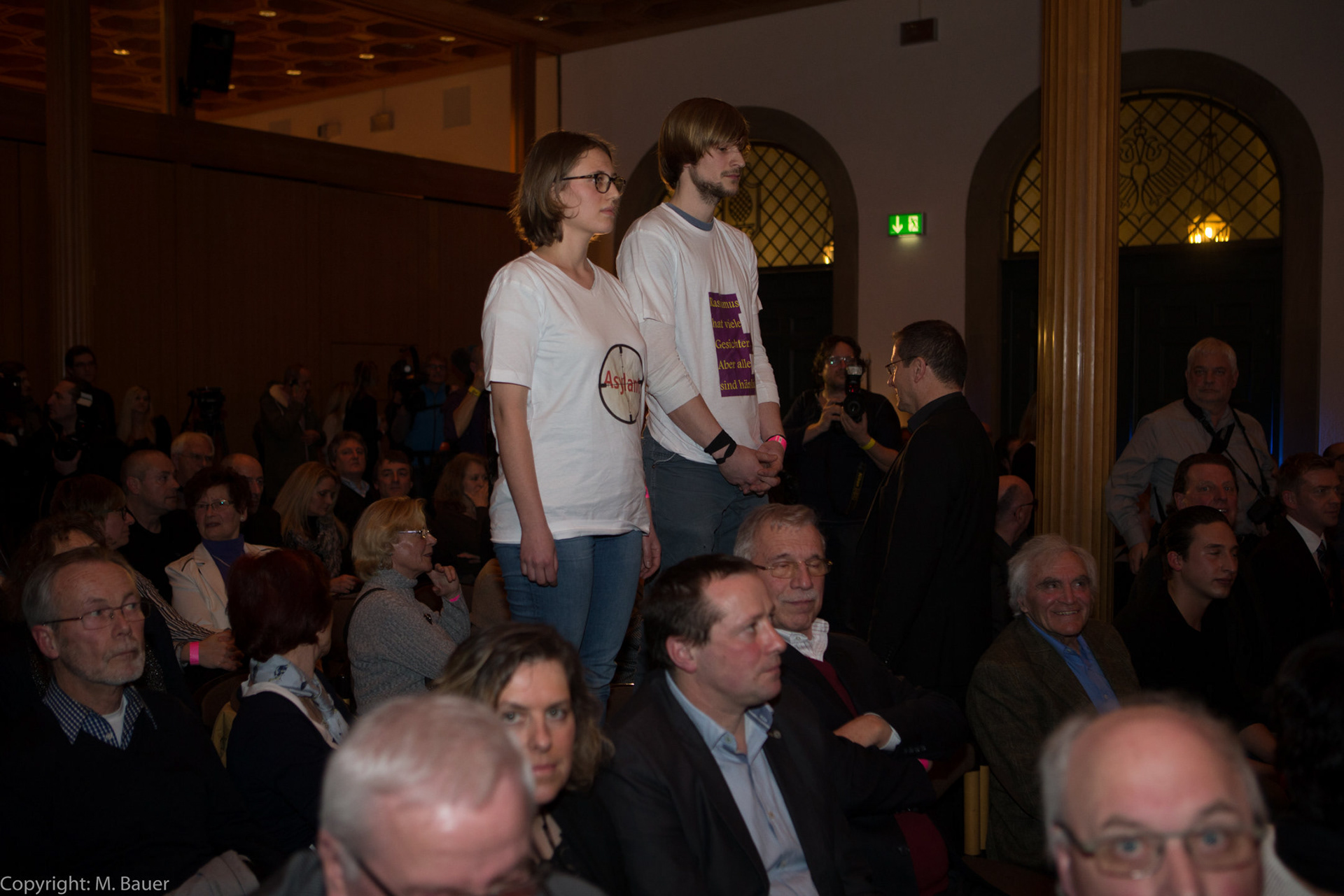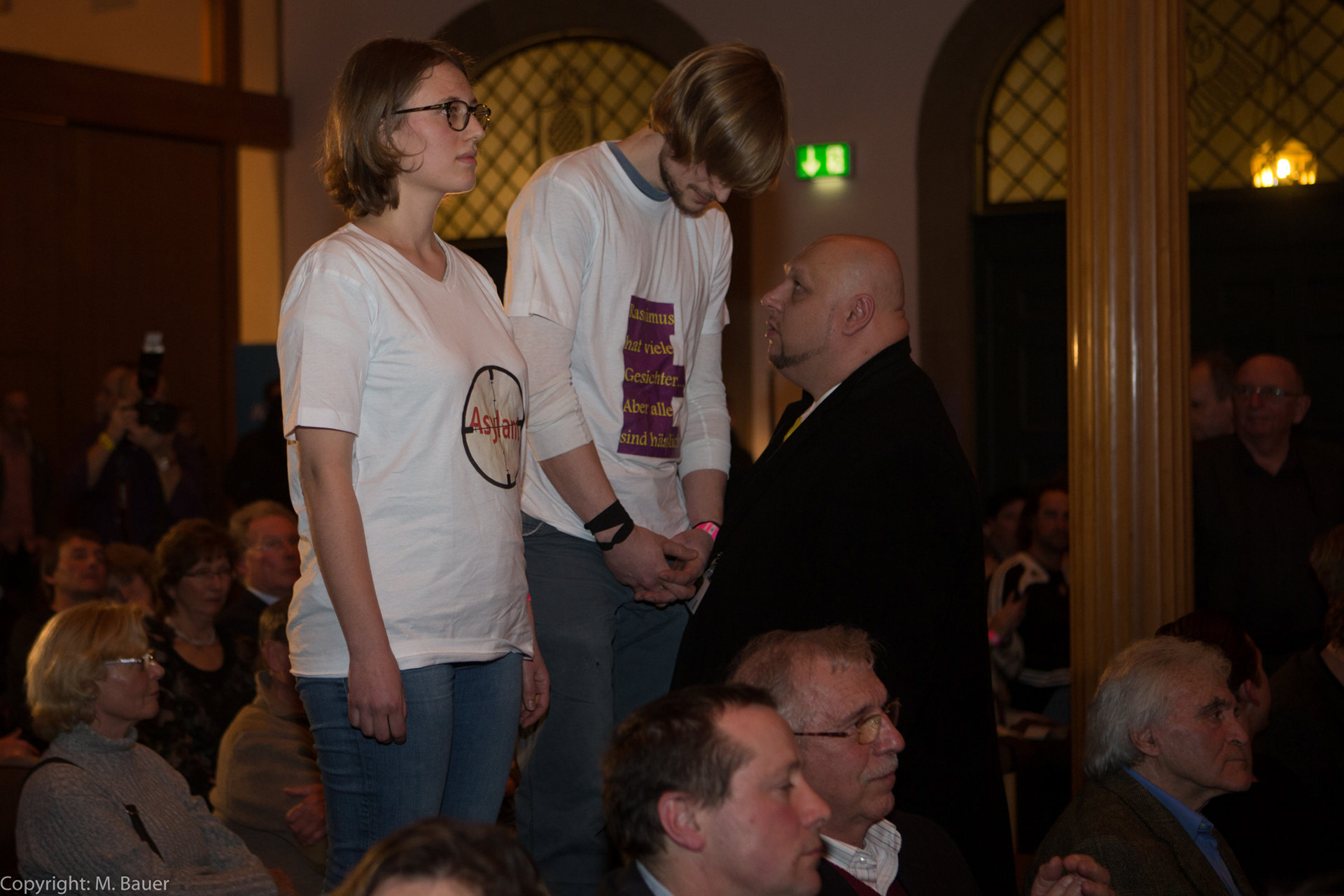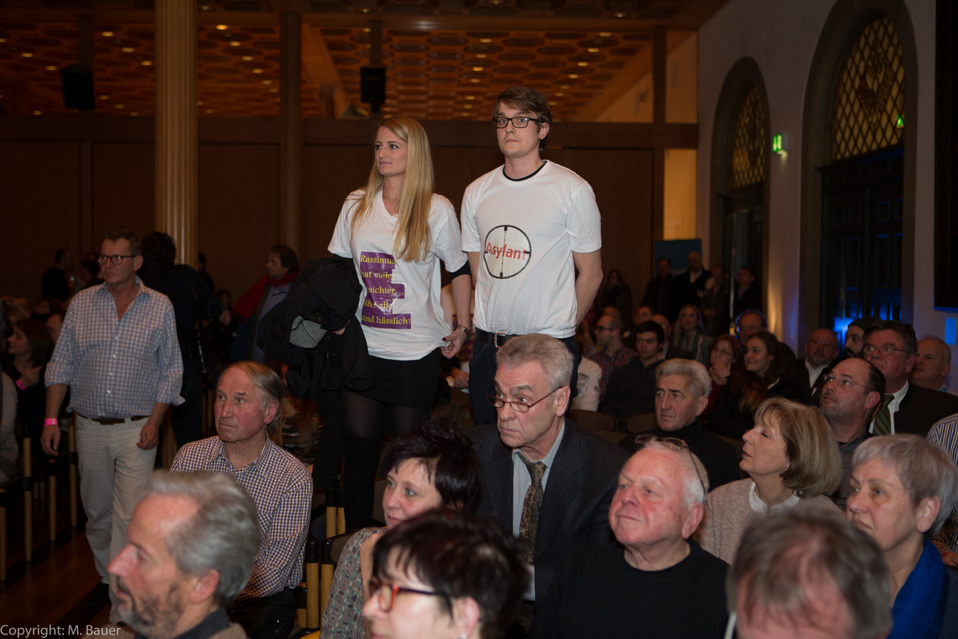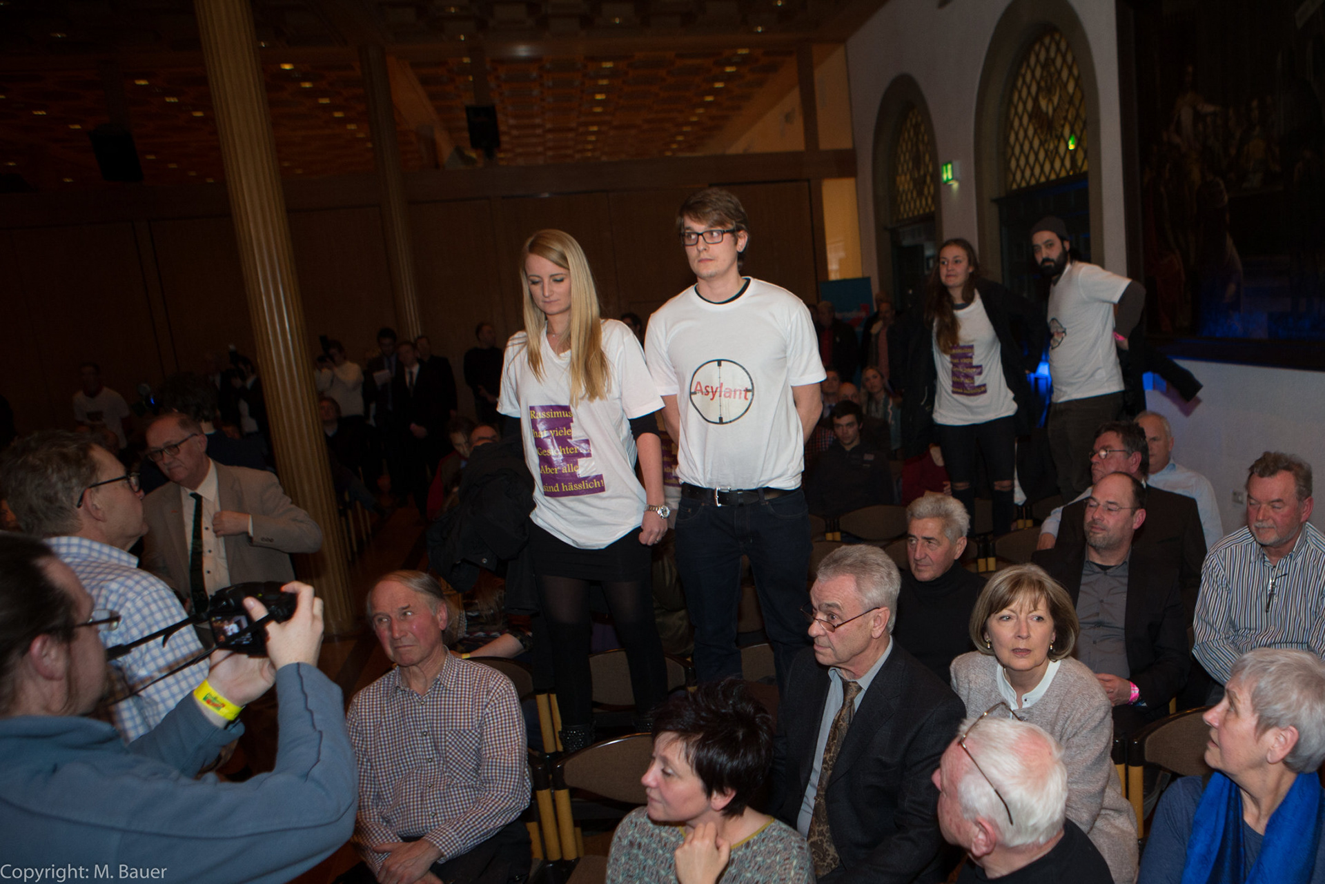 Auch im Rathaus nahm die Veranstaltung, zu der 250 Personen und 50 Journalisten gekommen waren, einen unfriedlichen Verlauf. Mit Beginn der Rede von Frauke Petry regte sich Widerspruch. Erste Aktivisten standen zum stillen Protest auf ihren Stühlen. Sie trugen T-Shirts mit der Aufschrift „Augsburg ist bunt“. Auf einem Oberteil stand „Asylant“, eingebettet in ein Fadenkreuz. Petry rief laut Bericht der Süddeutschen dazu auf, die Aktion zu ignorieren.