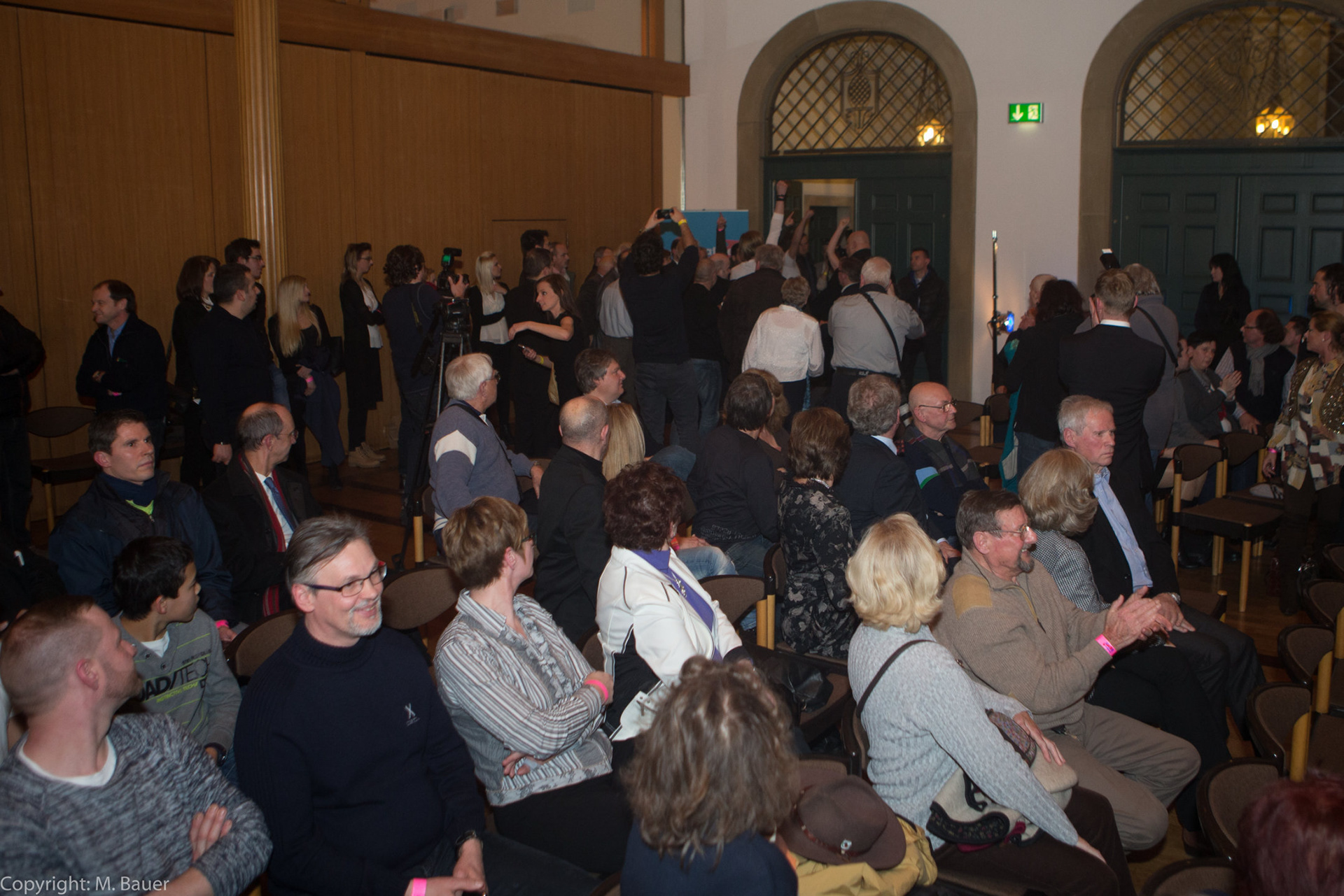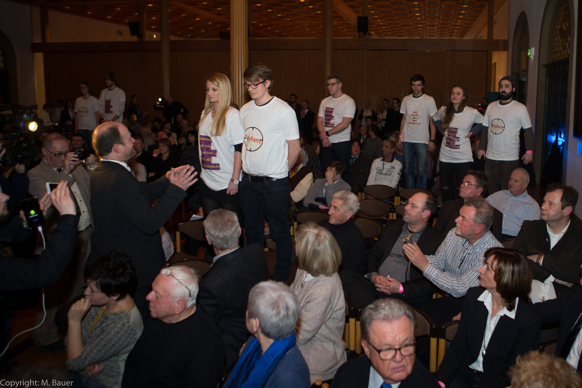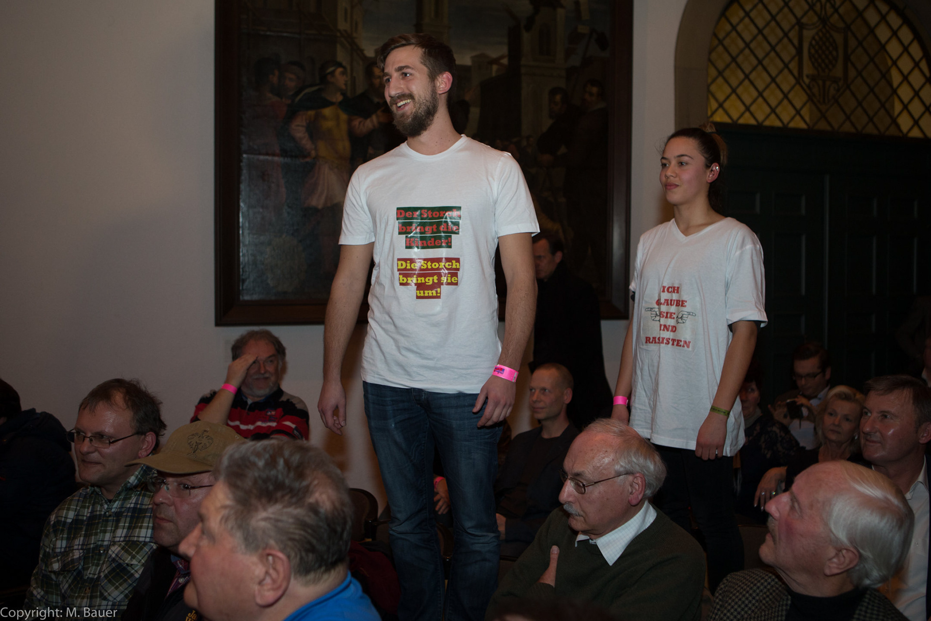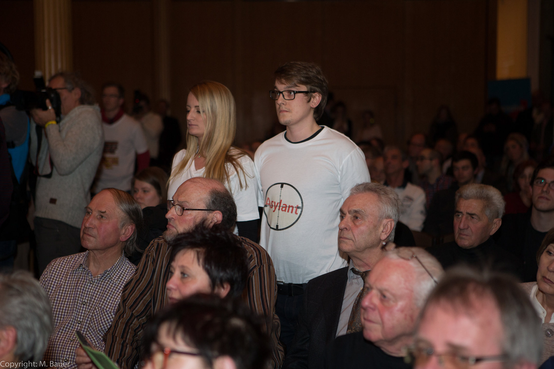 Auch im Rathaus nahm die Veranstaltung, zu der 250 Personen und 50 Journalisten gekommen waren, einen unfriedlichen Verlauf. Mit Beginn der Rede von Frauke Petry regte sich Widerspruch. Erste Aktivisten standen zum stillen Protest auf ihren Stühlen. Sie trugen T-Shirts mit der Aufschrift „Augsburg ist bunt“. Auf einem Oberteil stand „Asylant“, eingebettet in ein Fadenkreuz. Petry rief laut Bericht der Süddeutschen dazu auf, die Aktion zu ignorieren.