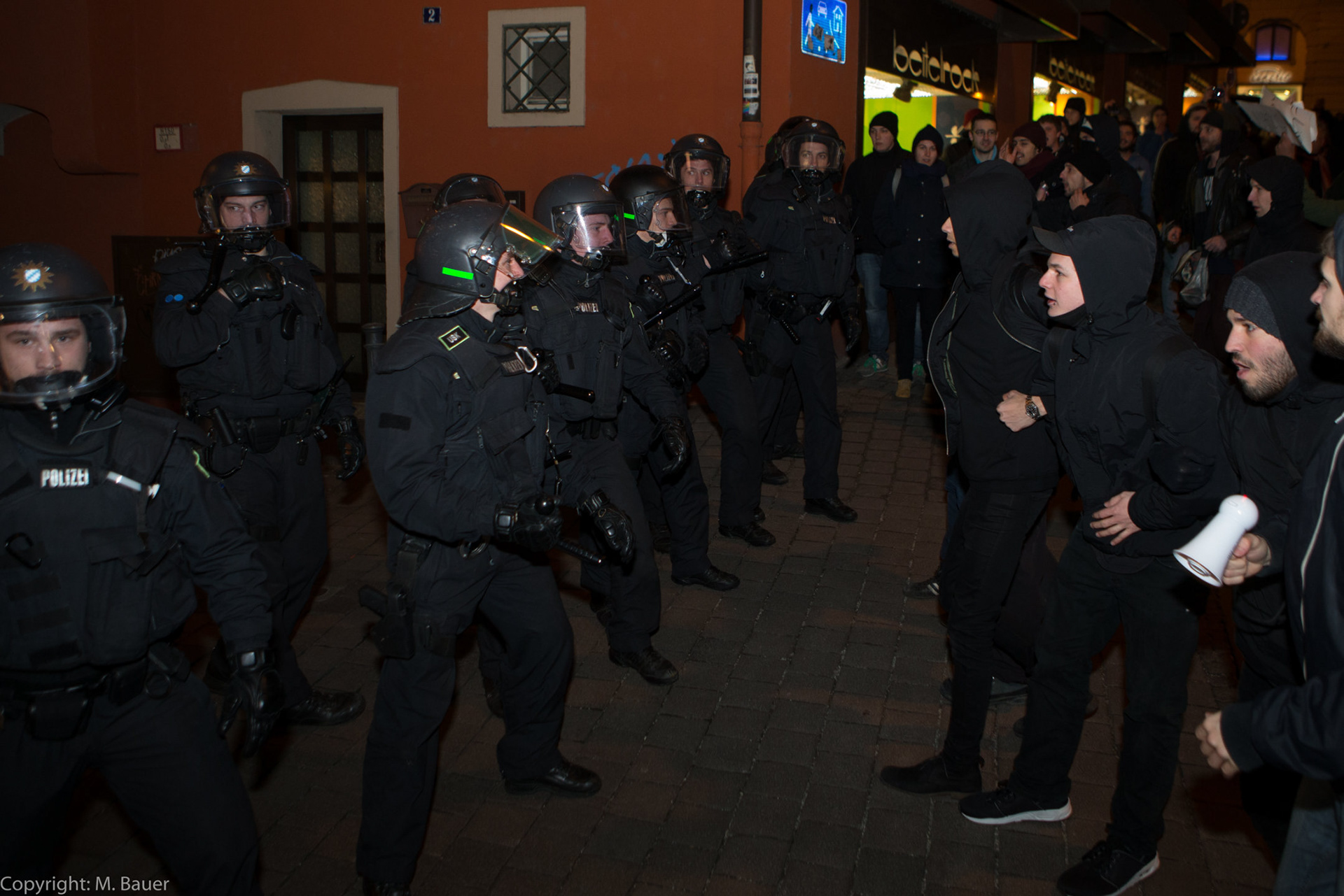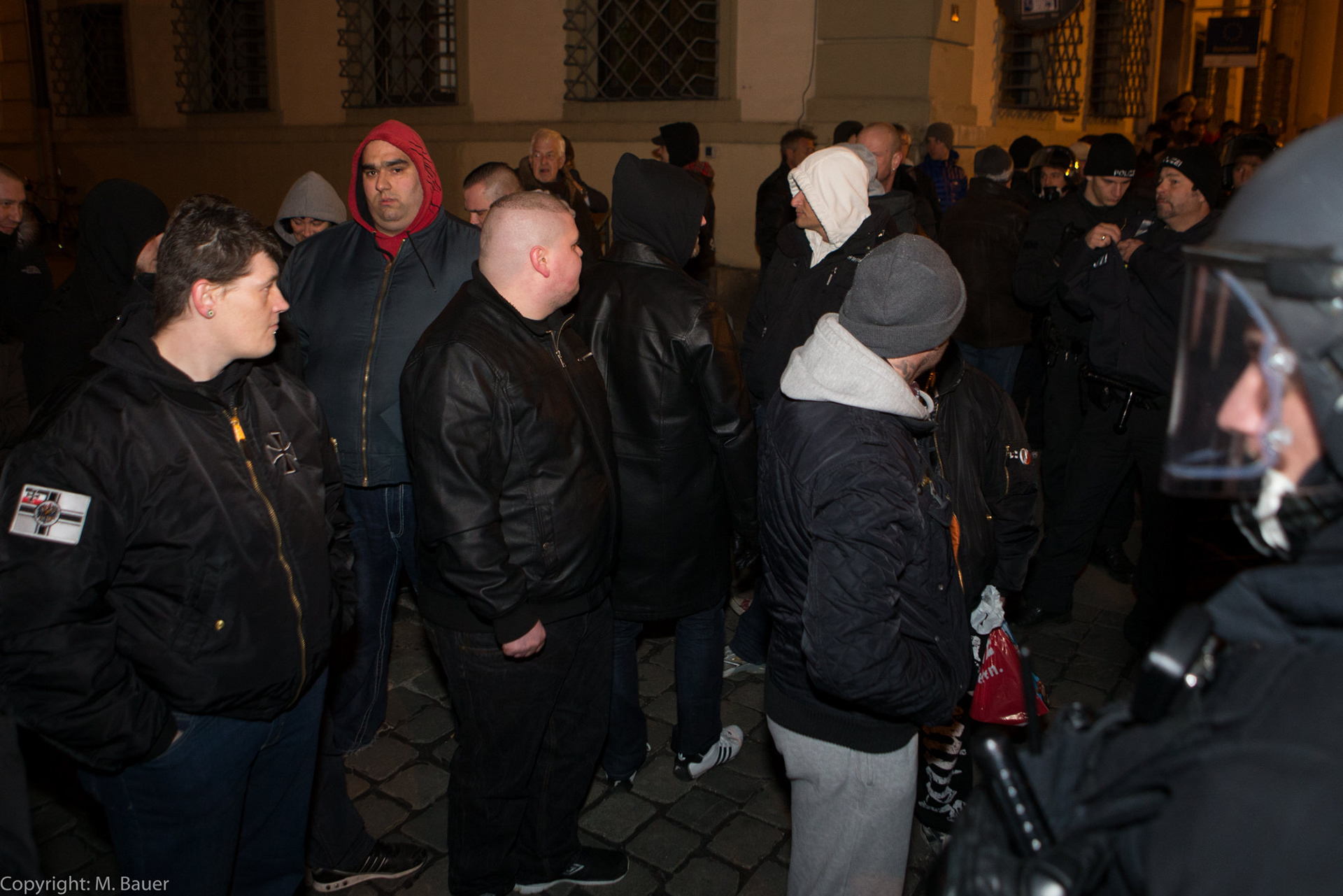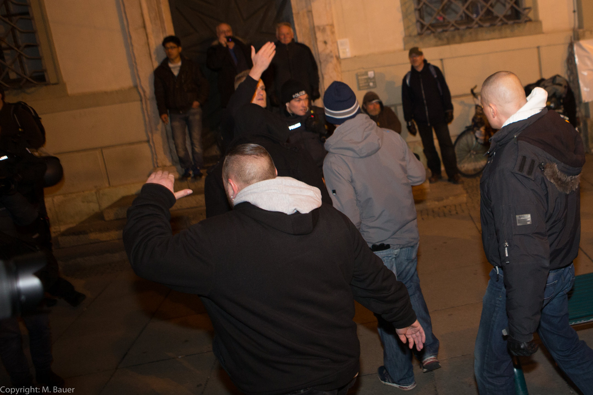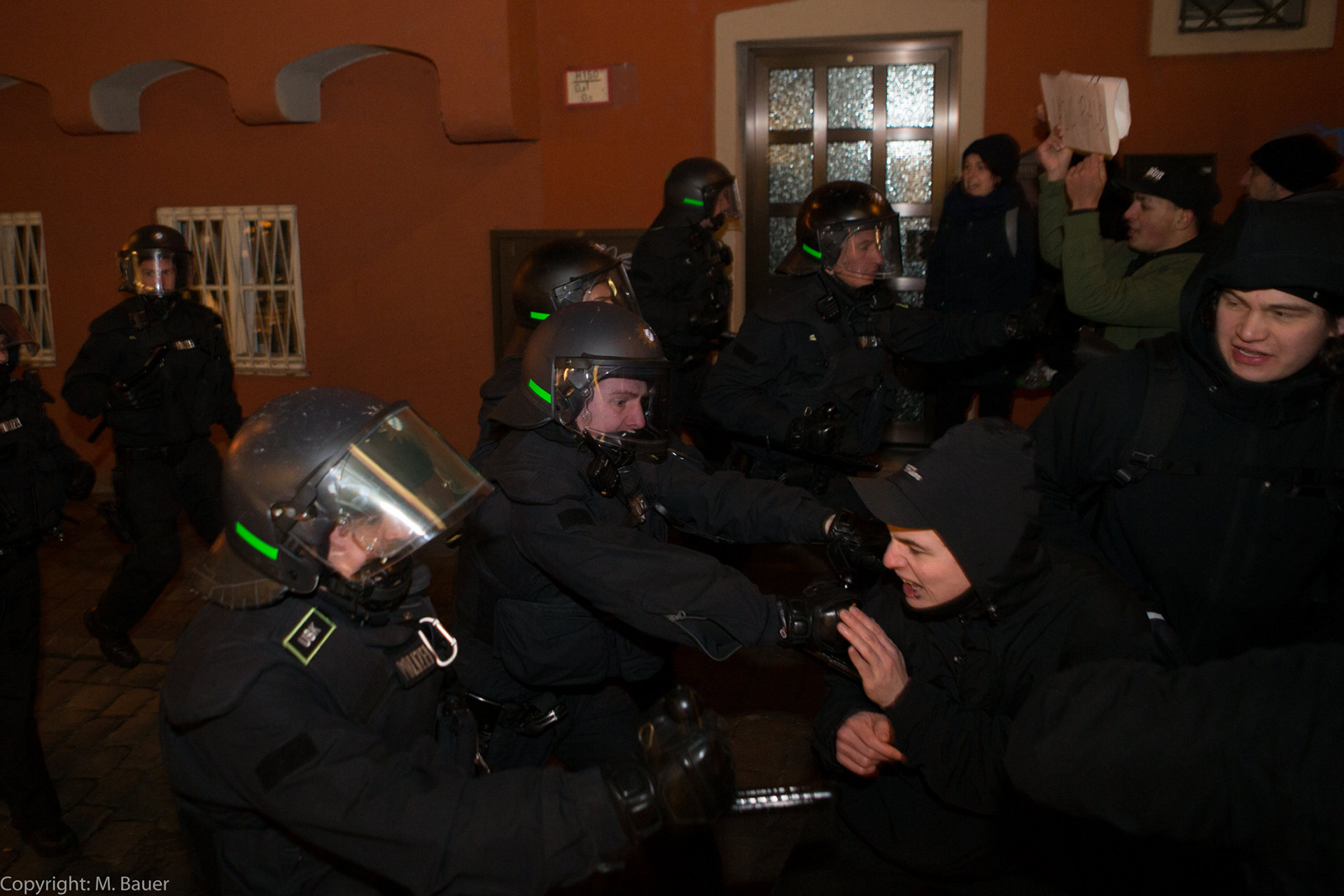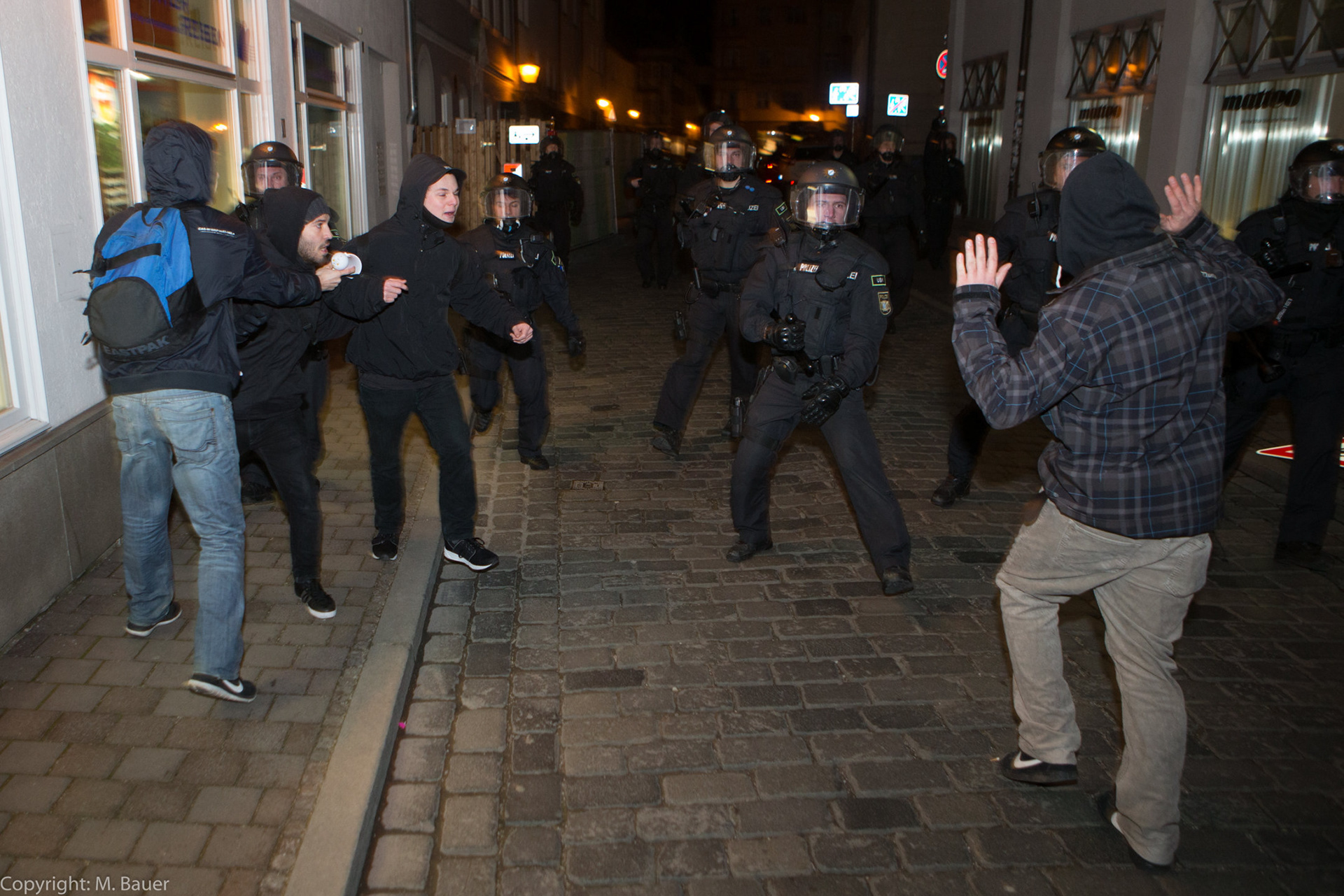 Bereits vor Beginn des Stadtratsempfangs um 19.30 Uhr marschierten rund 15 einschlägig bekannte Neonazis auf. Einer trug einen Aufnäher in Form einer Reichskriegsflagge, ein anderer einen Pullover mit schwarzer Sonne und SS-Totenkopf. Schon innerhalb kürzester Zeit kam es am Seiteneingang, den die Anhänger der AfD benutzen mussten, zu mehreren Handgreiflichkeiten zwischen Neonazis und Gegendemonstranten. Die Situation konnte nur durch den Einsatz mehrerer Polizisten unter Kontrolle gebracht werden. Den extrem Rechten wurde der Zugang zur Veranstaltung verwehrt. In der Folge kam es in der Stadt vereinzelt zu Verfolgungsjagden mit Angehörigen der linken Szene. Die Polizei drängte zum Teil mit Gewalt Demonstranten und Medienvertreter zurück.