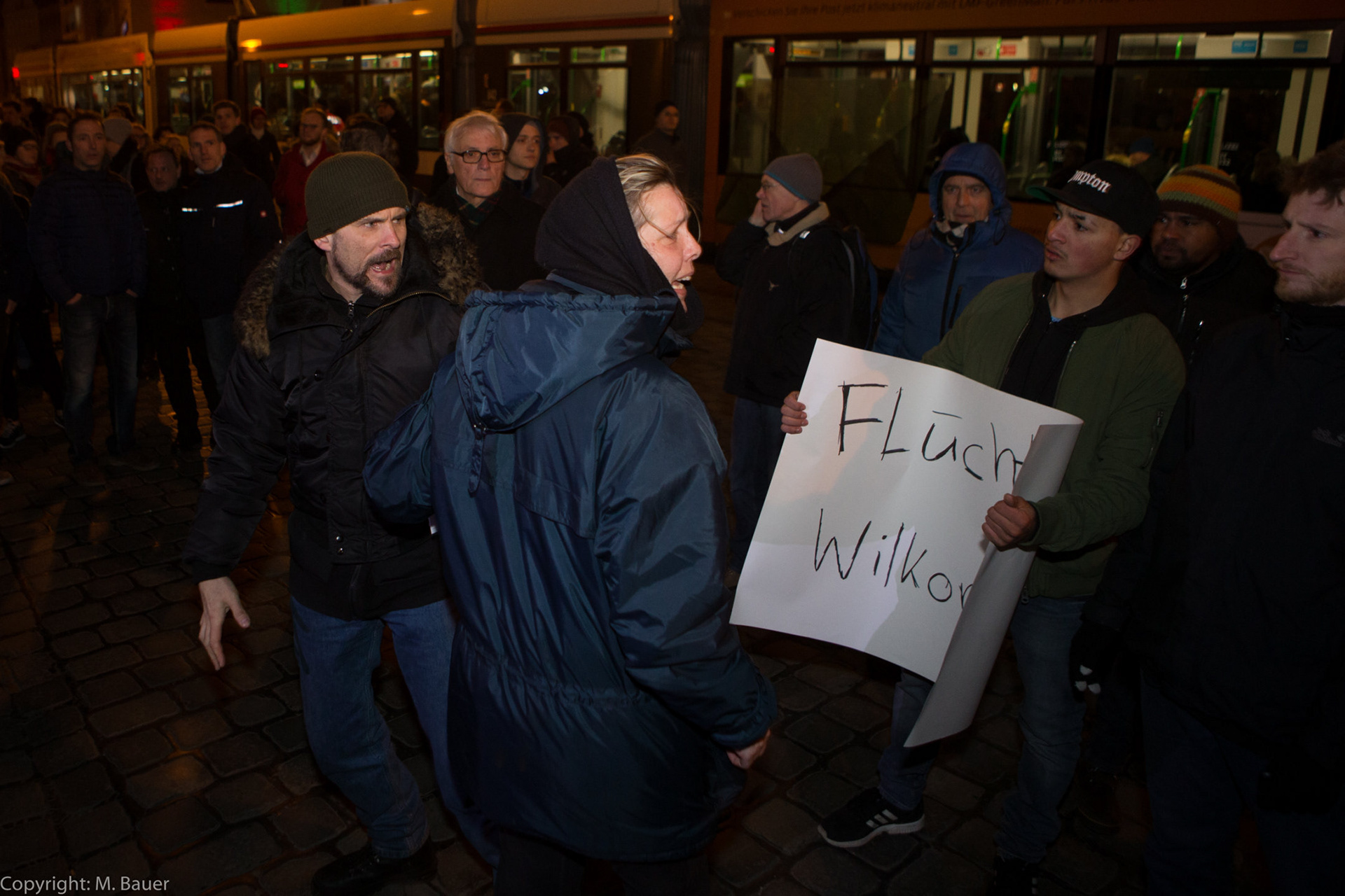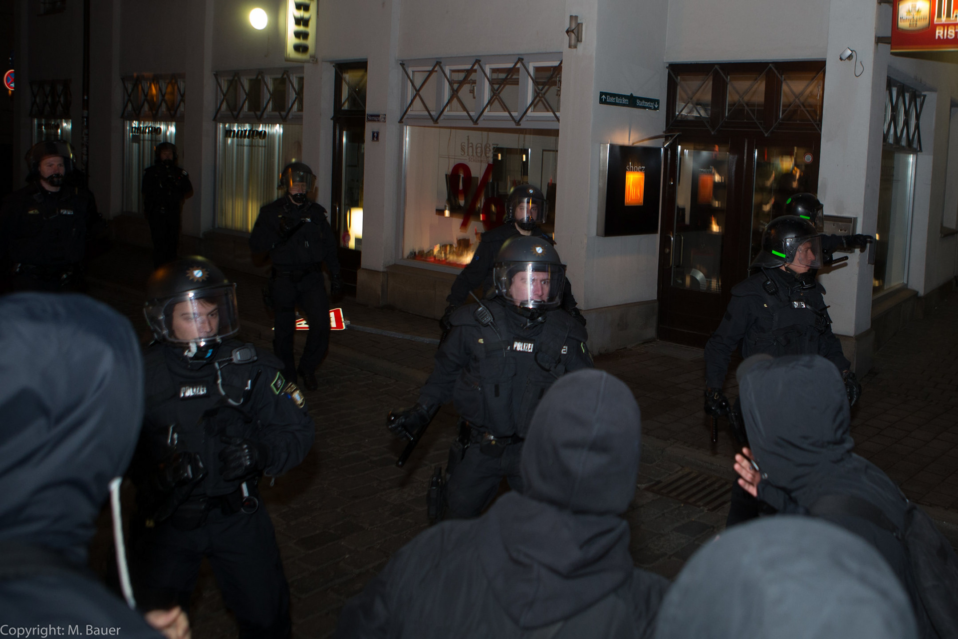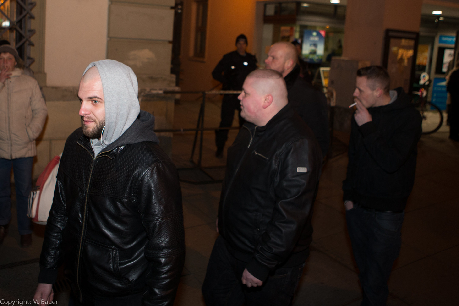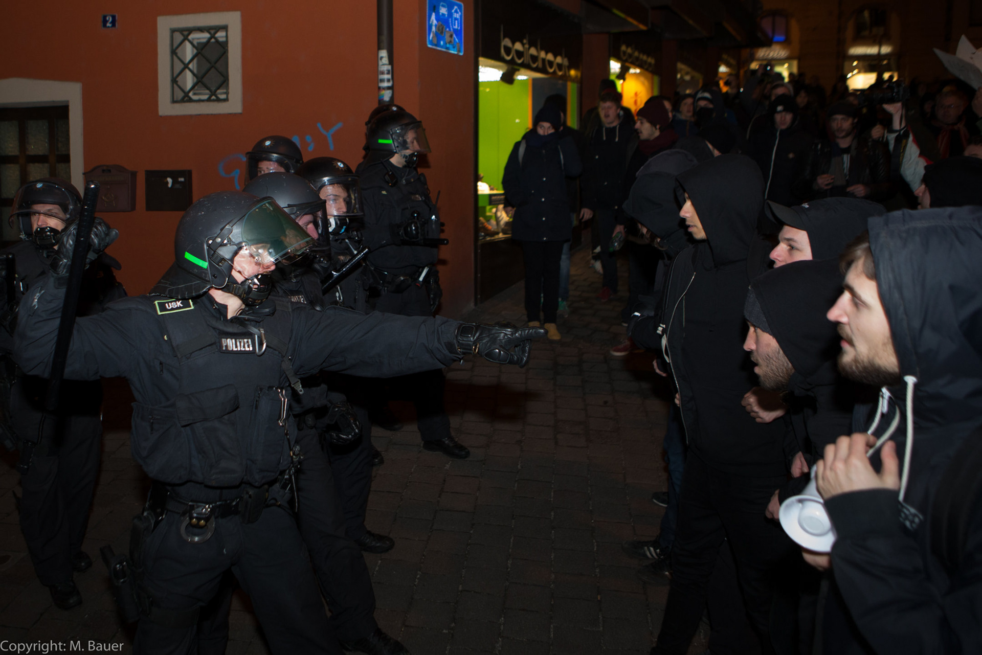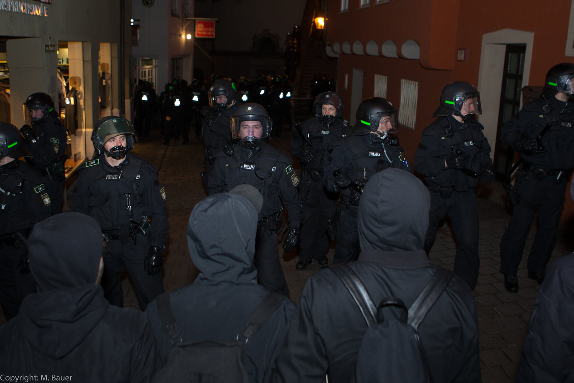 Bereits vor Beginn des Stadtratsempfangs um 19.30 Uhr marschierten rund 15 einschlägig bekannte Neonazis auf. Einer trug einen Aufnäher in Form einer Reichskriegsflagge, ein anderer einen Pullover mit schwarzer Sonne und SS-Totenkopf. Schon innerhalb kürzester Zeit kam es am Seiteneingang, den die Anhänger der AfD benutzen mussten, zu mehreren Handgreiflichkeiten zwischen Neonazis und Gegendemonstranten. Die Situation konnte nur durch den Einsatz mehrerer Polizisten unter Kontrolle gebracht werden. Den extrem Rechten wurde der Zugang zur Veranstaltung verwehrt. In der Folge kam es in der Stadt vereinzelt zu Verfolgungsjagden mit Angehörigen der linken Szene. Die Polizei drängte zum Teil mit Gewalt Demonstranten und Medienvertreter zurück.