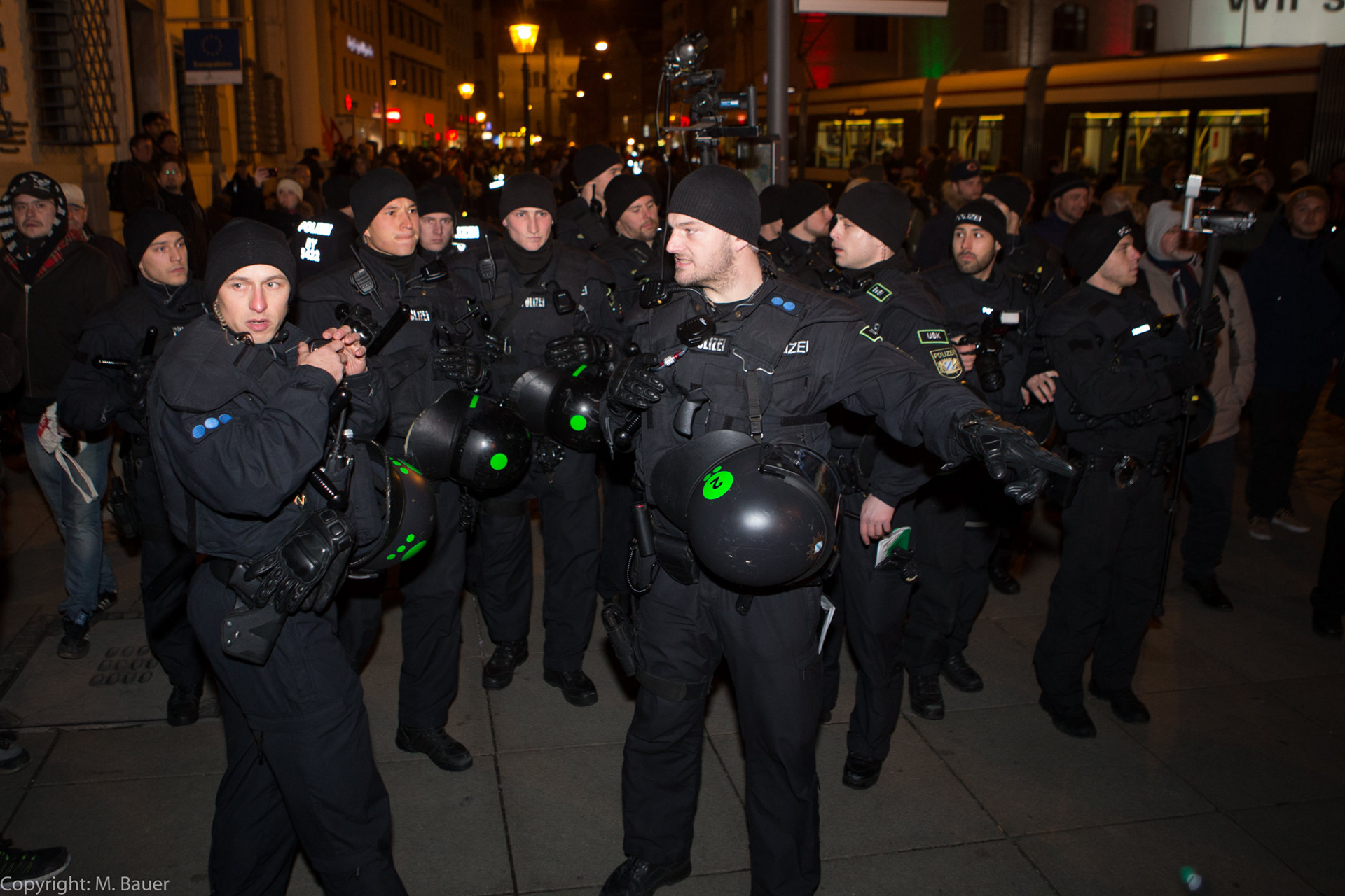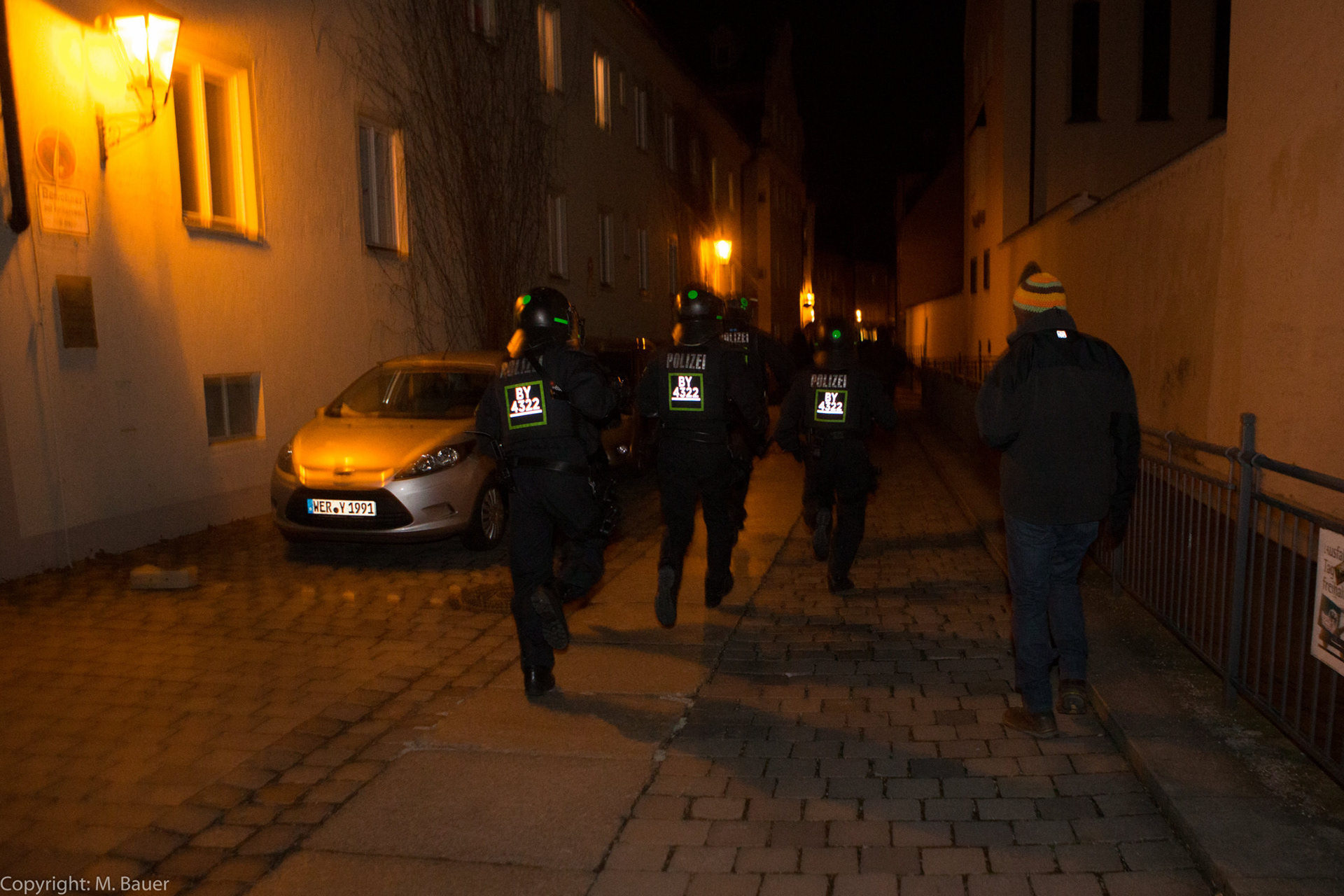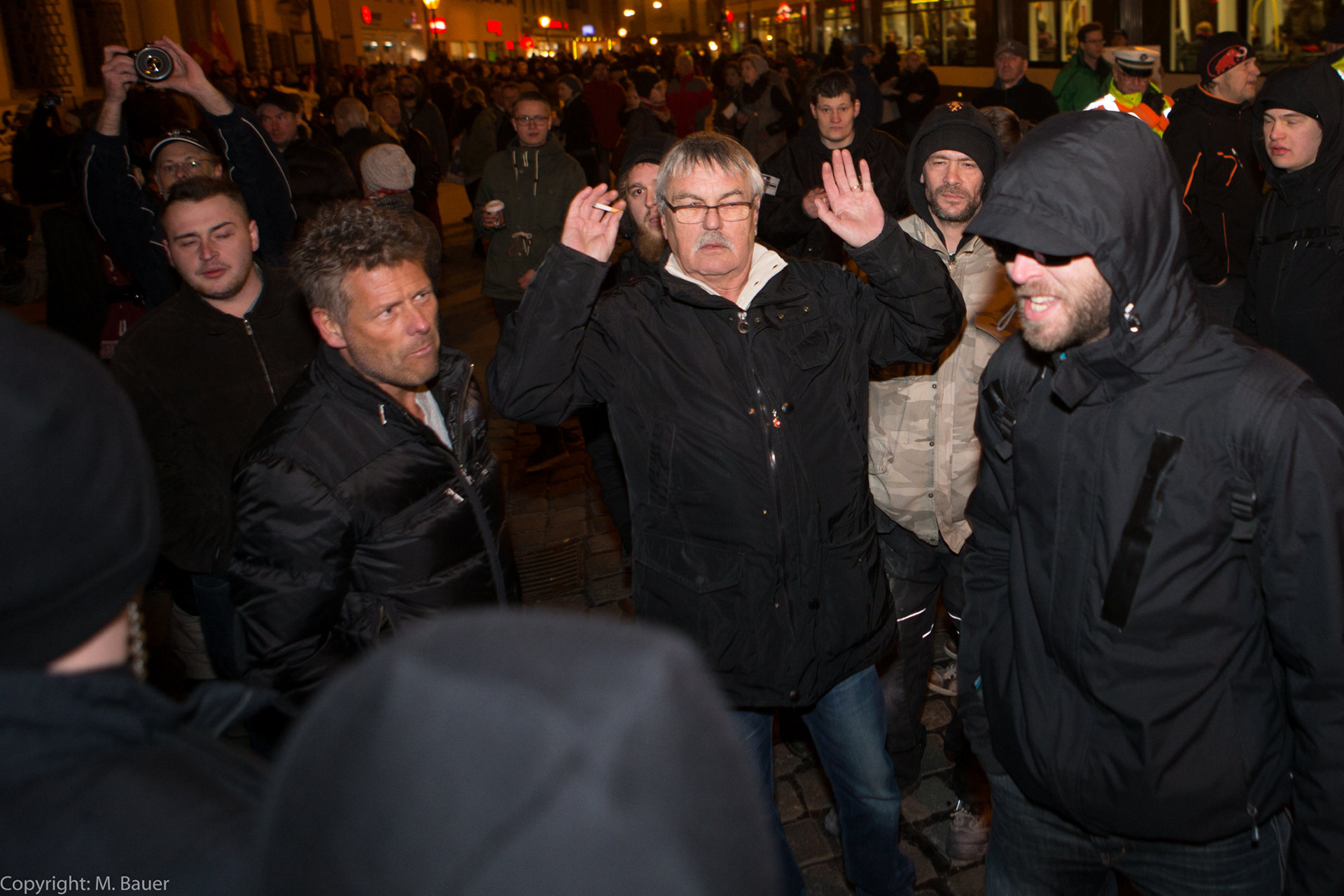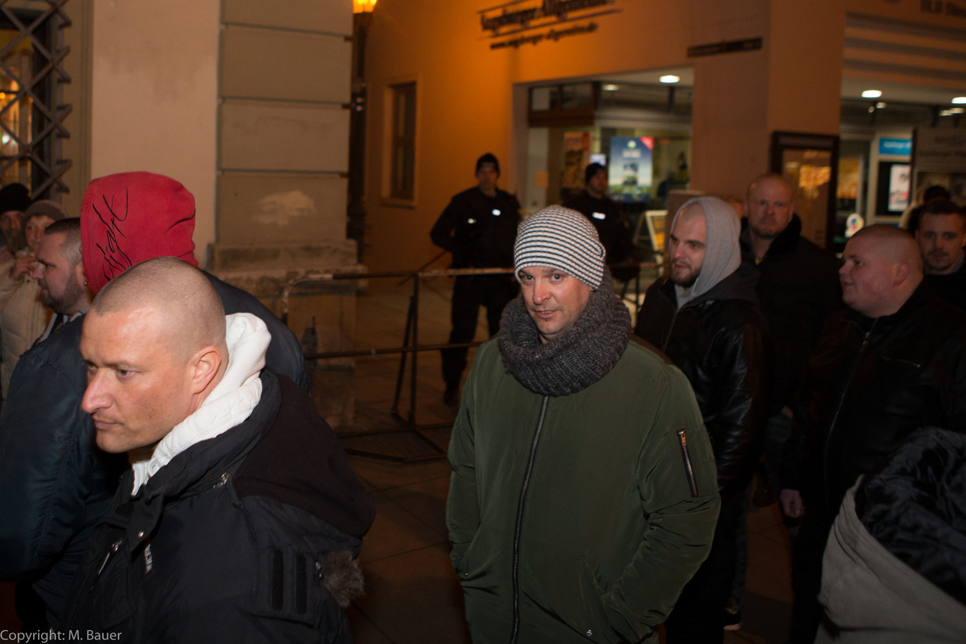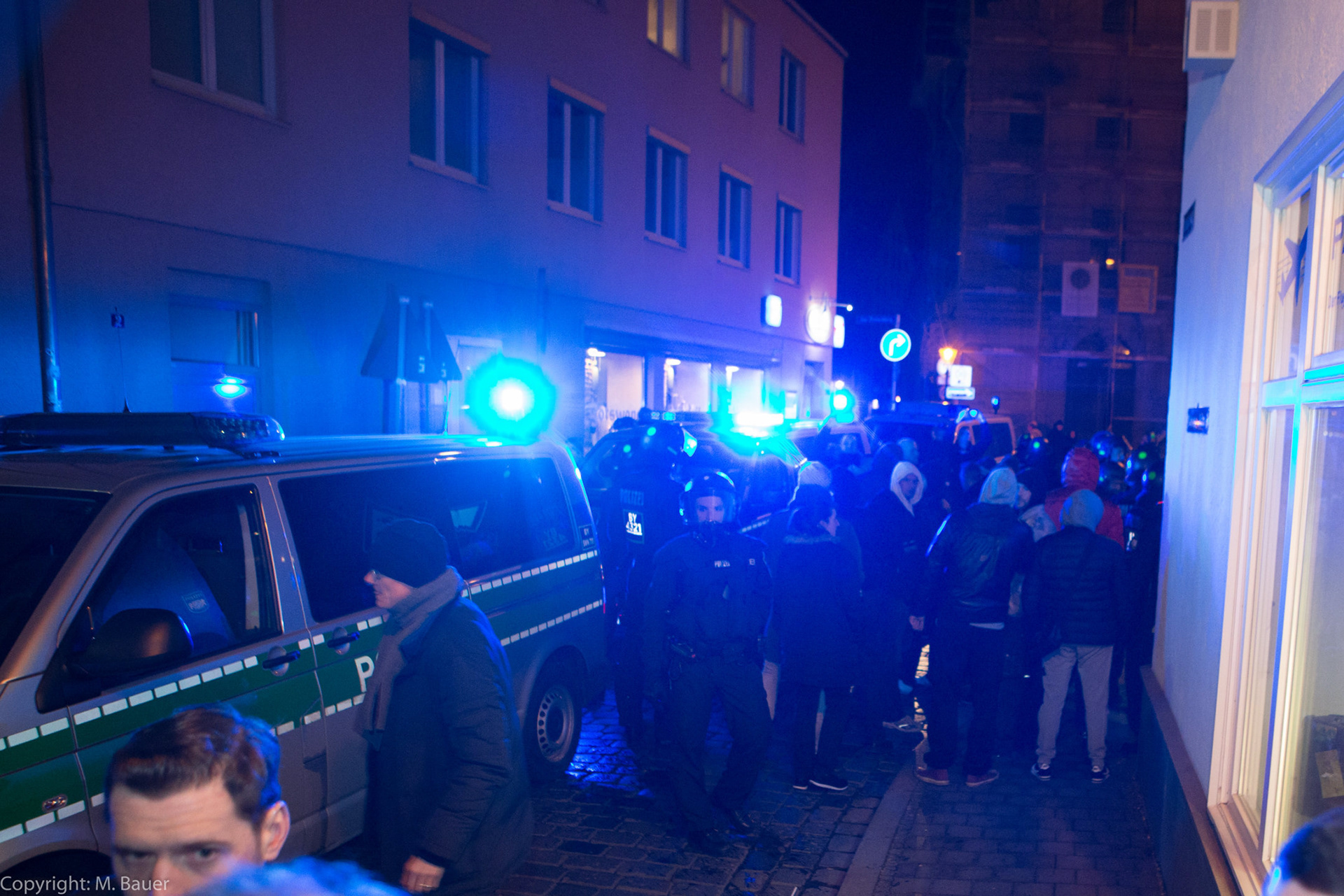 Bereits vor Beginn des Stadtratsempfangs um 19.30 Uhr marschierten rund 15 einschlägig bekannte Neonazis auf. Einer trug einen Aufnäher in Form einer Reichskriegsflagge, ein anderer einen Pullover mit schwarzer Sonne und SS-Totenkopf. Schon innerhalb kürzester Zeit kam es am Seiteneingang, den die Anhänger der AfD benutzen mussten, zu mehreren Handgreiflichkeiten zwischen Neonazis und Gegendemonstranten. Die Situation konnte nur durch den Einsatz mehrerer Polizisten unter Kontrolle gebracht werden. Den extrem Rechten wurde der Zugang zur Veranstaltung verwehrt. In der Folge kam es in der Stadt vereinzelt zu Verfolgungsjagden mit Angehörigen der linken Szene. Die Polizei drängte zum Teil mit Gewalt Demonstranten und Medienvertreter zurück.