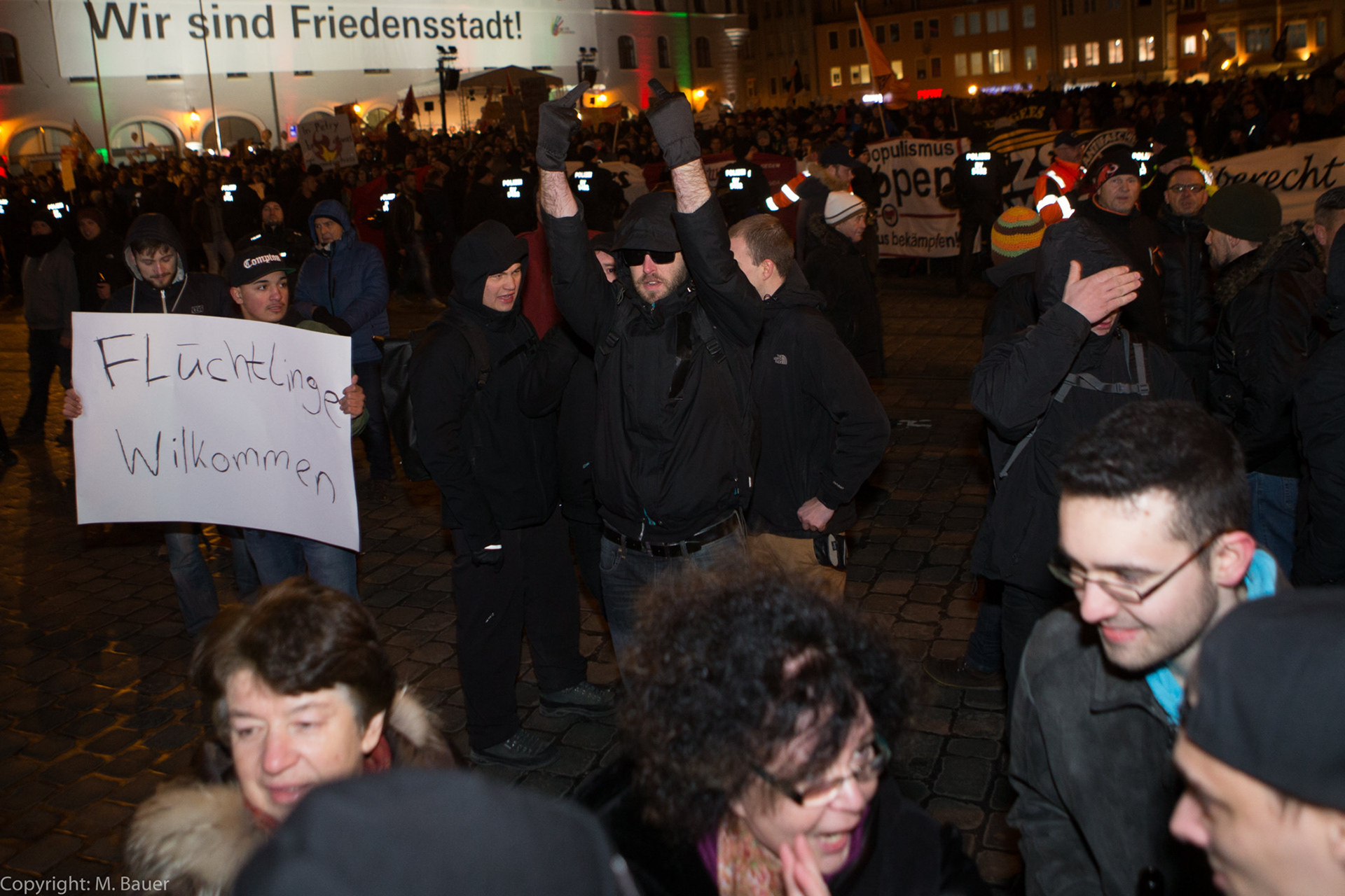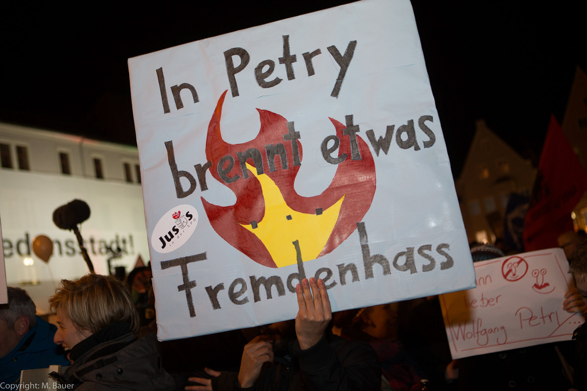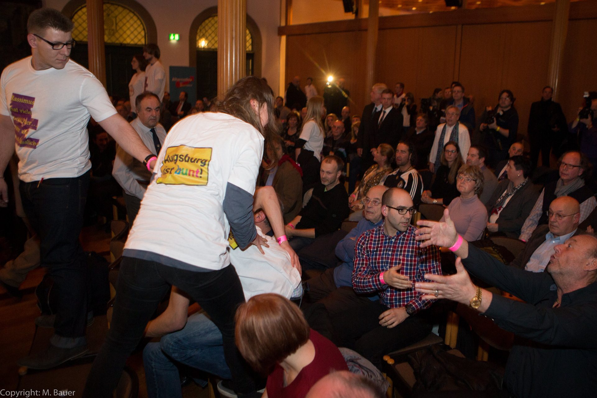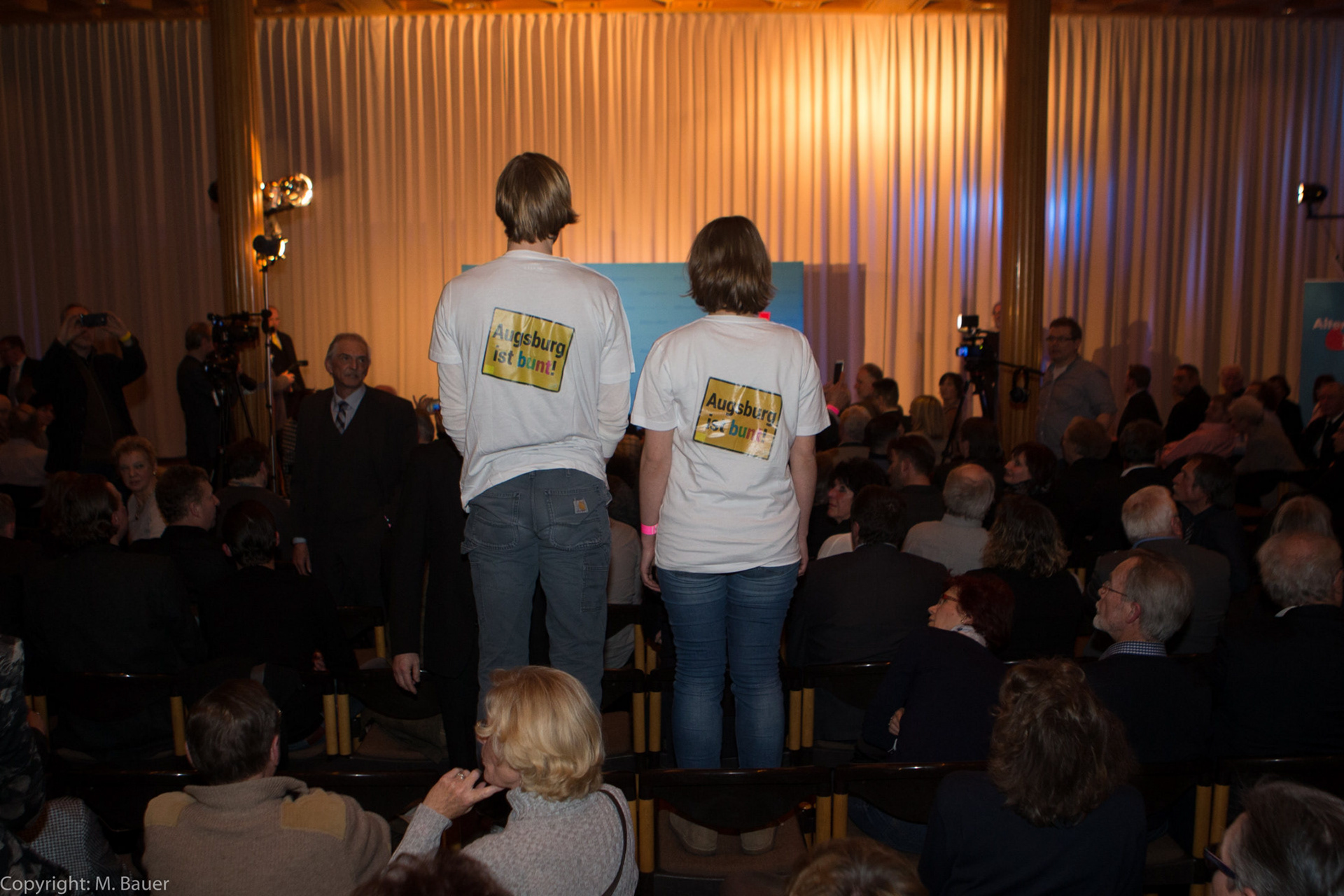 Mit einer großen Kundgebung wurde in Augsburg gegen eine Veranstaltung der AfD im Rathaus protestiert, die juristisch nicht zu verhindern war. Eine Gruppe Neonazis versuchte sich der Veranstaltung mit der AfD-Vorsitzenden Frauke Petry anzuschließen. Im Saal kam es zu Handgreiflichkeiten gegen Personen, die dort gegen die umstrittenen Äußerungen Petrys Position bezogen.