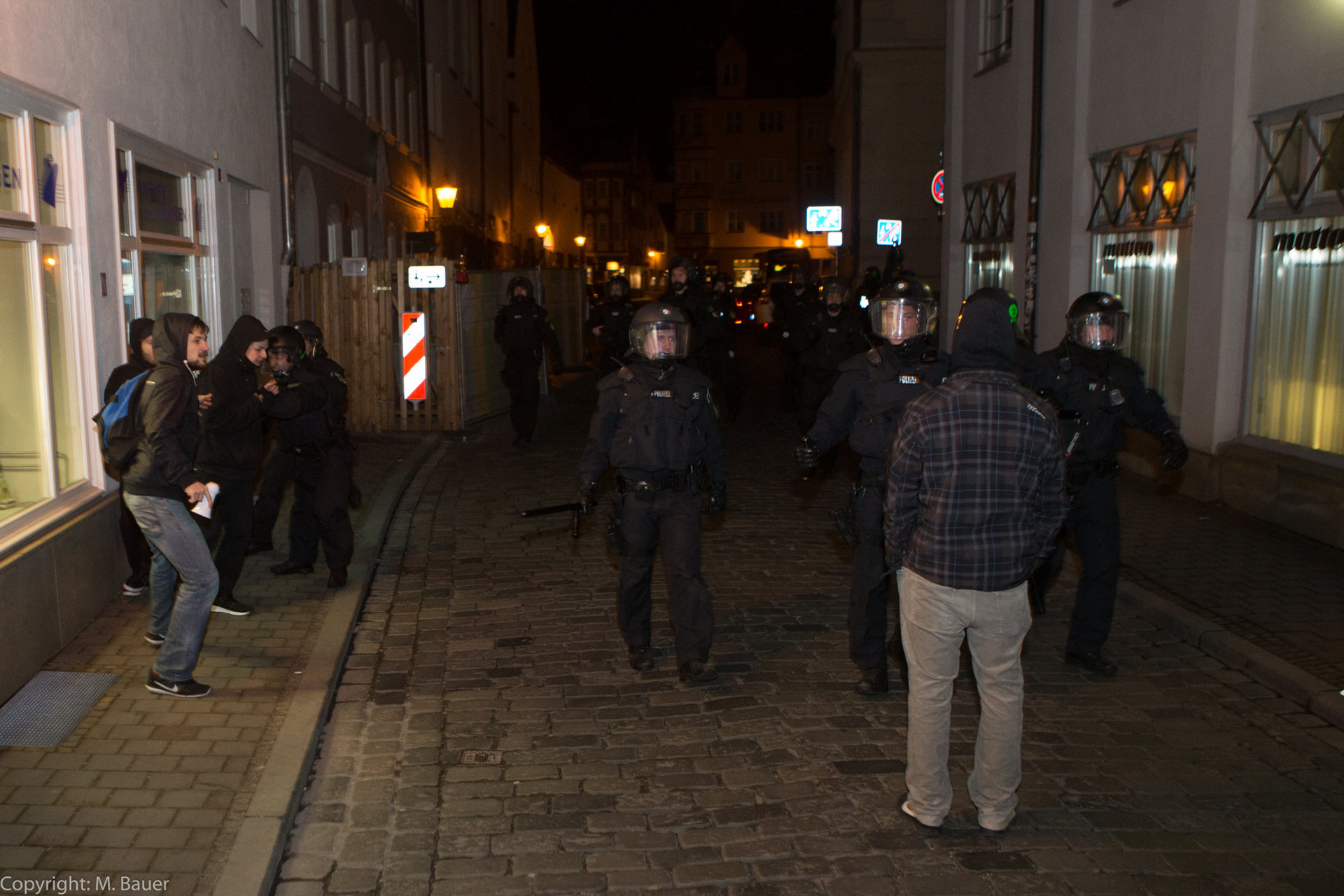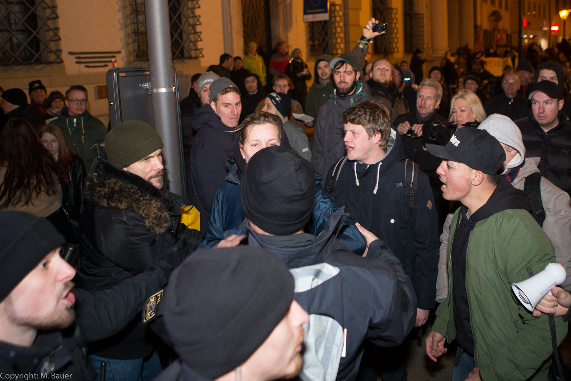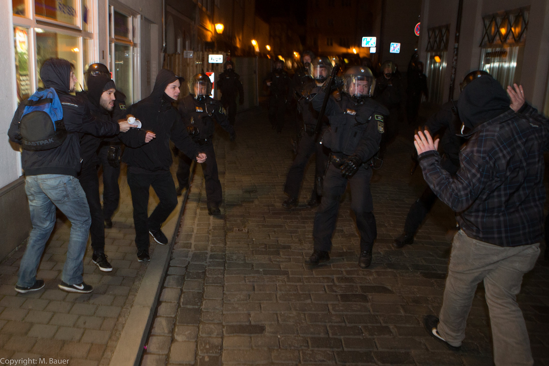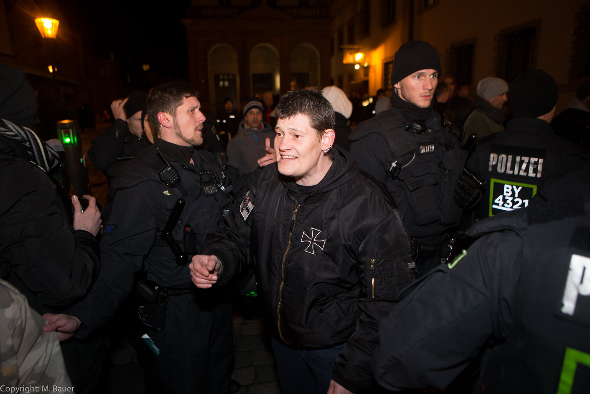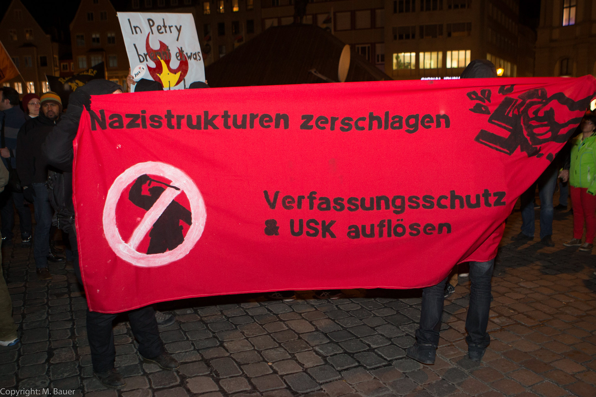Mit einer großen Kundgebung wurde in Augsburg gegen eine Veranstaltung der AfD im Rathaus protestiert, die juristisch nicht zu verhindern war. Eine Gruppe Neonazis versuchte sich der Veranstaltung mit der AfD-Vorsitzenden Frauke Petry anzuschließen. Im Saal kam es zu Handgreiflichkeiten gegen Personen, die dort gegen die umstrittenen Äußerungen Petrys Position bezogen.