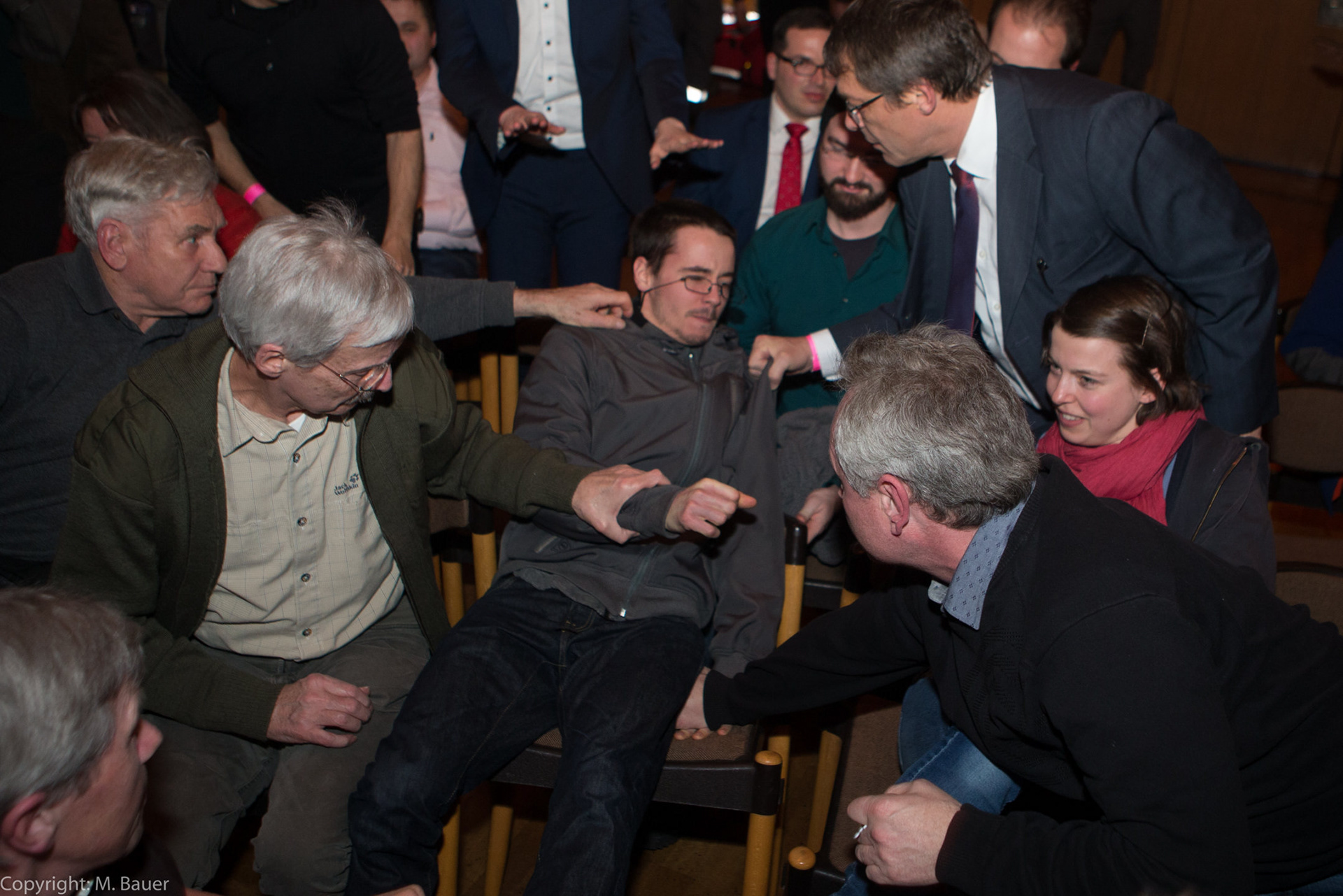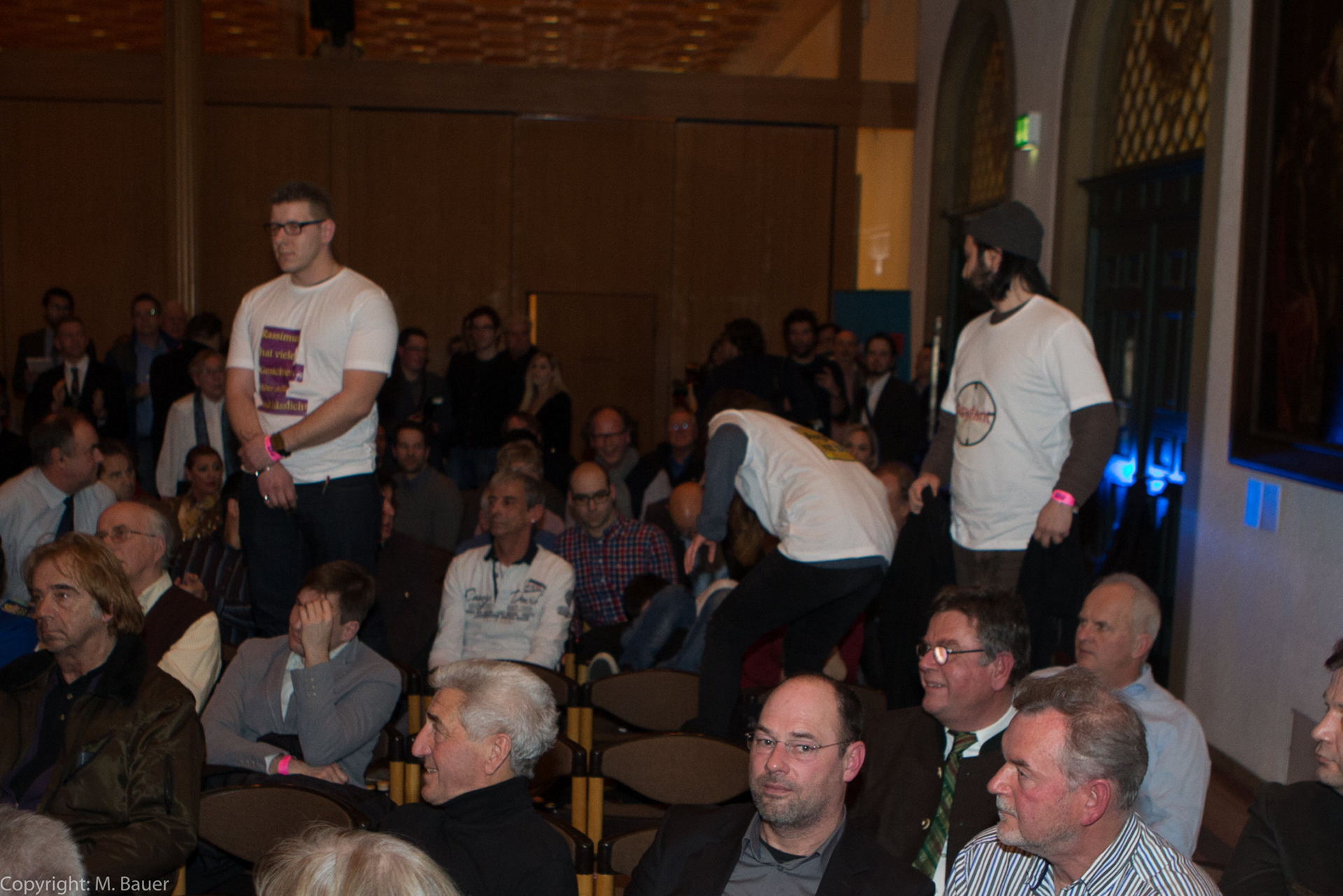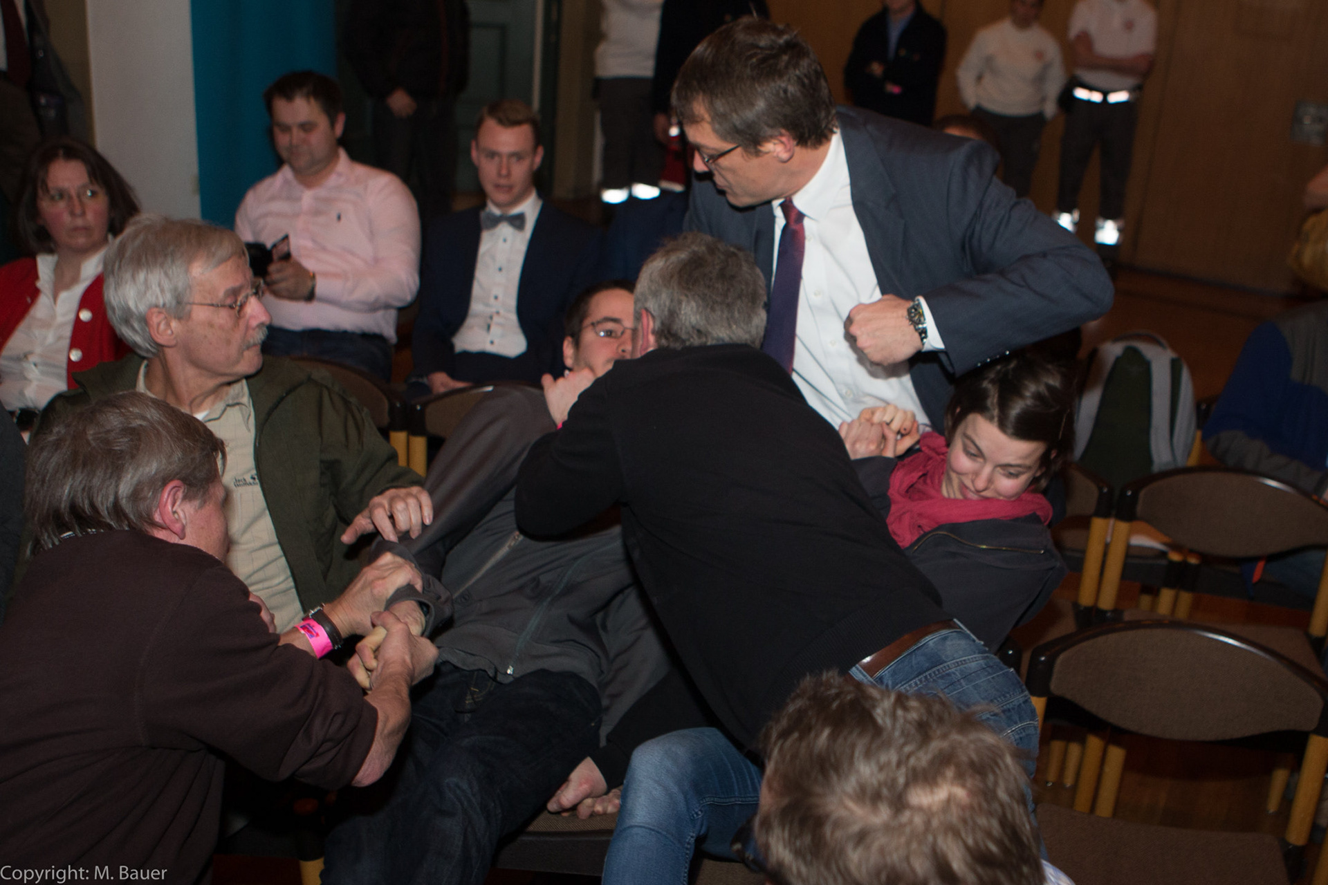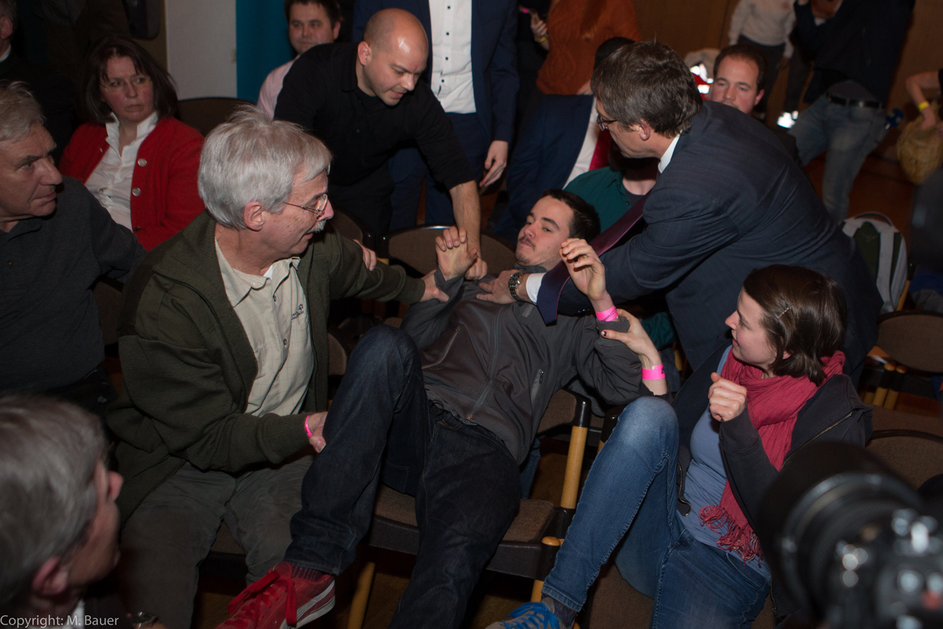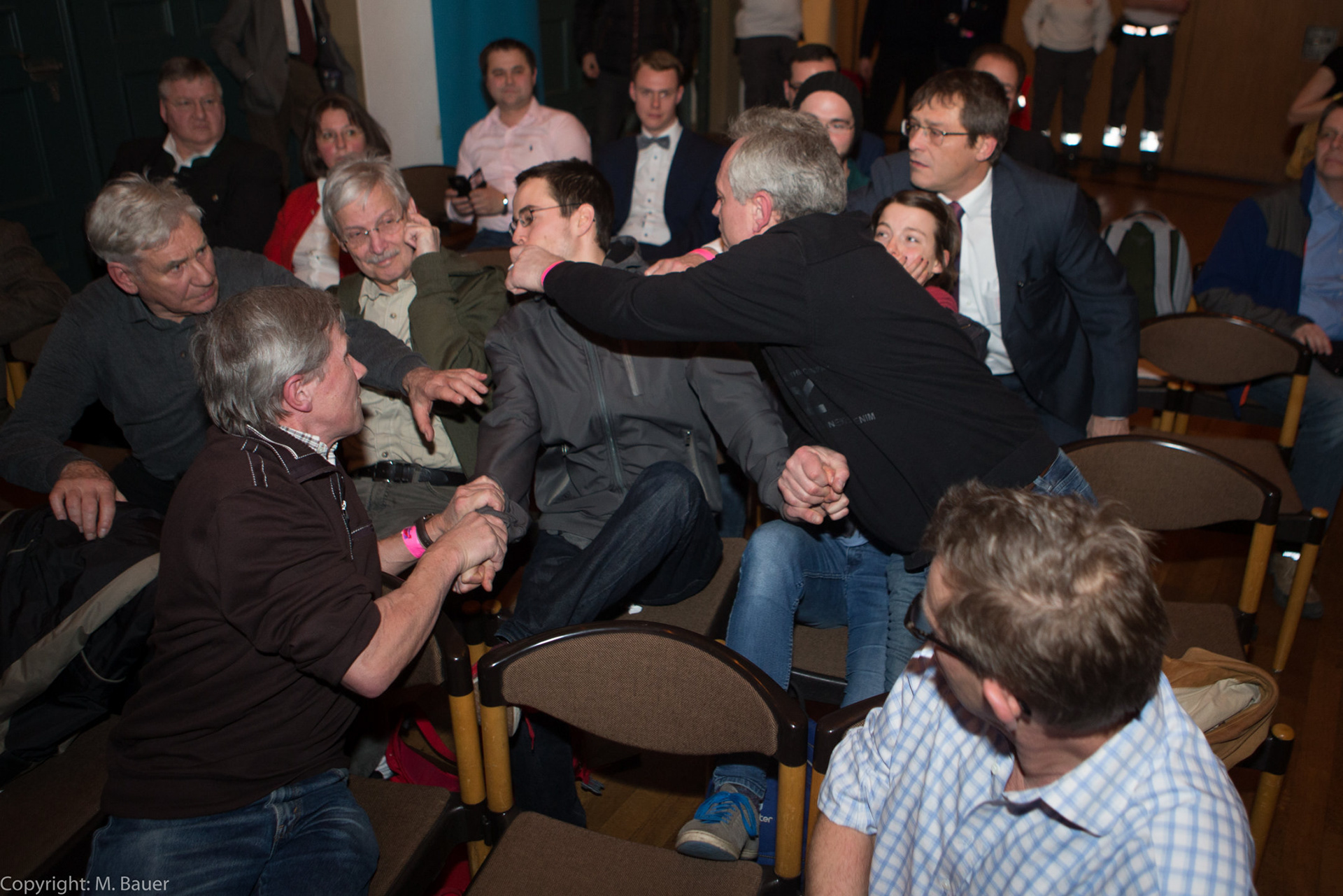 Die AfD-Anhänger reagierten dagegen zum Teil äußerst aggressiv mit Beleidigungen und körperlichen Angriffen, mehrfach wurden die Protestierenden von ihren Stühlen gestoßen. Ein AfD-Gegner wurde von mehreren Personen attackiert und geschlagen. Nach dem Einsatz von Trillerpfeifen, so berichtet es die Süddeutsche Zeitung, drängte der Sicherheitsdienst der AfD die unliebsamen Personen aus dem Saal. Die Polizei kesselte die Gegendemonstranten nach Verlassen des Saales ein und stellte die Personalien fest.