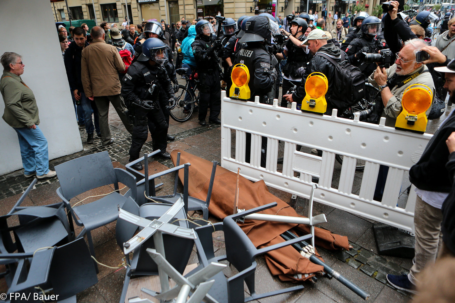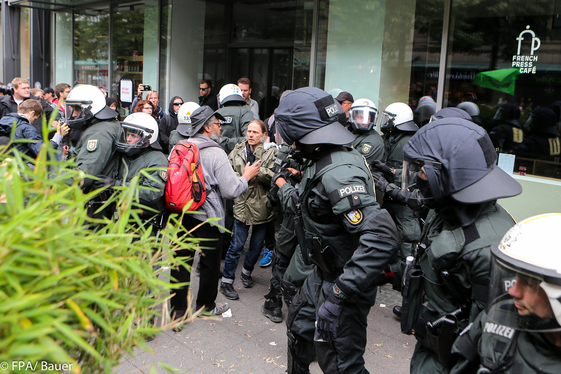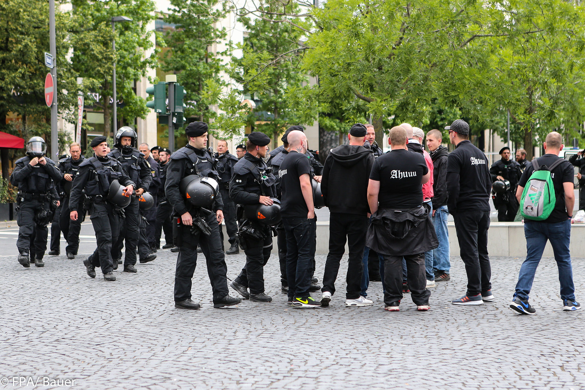Bestimmt wurde das Bild vor allem von zahlreichen Hooligangruppen, die den Weg nach Frankfurt gefunden hatten. Beobachter erkannten die „Berserker“ aus Pforzheim und deren Ableger aus Wolfsburg. Andere Anhänger bekannten sich zu den Fußballklubs aus Dresden, Gelsenkirchen und Kaiserslautern. PI-Autor Stürzenberger fuhr ihnen um den Bart und verharmloste ihr Treiben als „fairen Sport“, später wollte er aber mögliche Sitzblockierer gerne „wegknüppeln“ lassen.