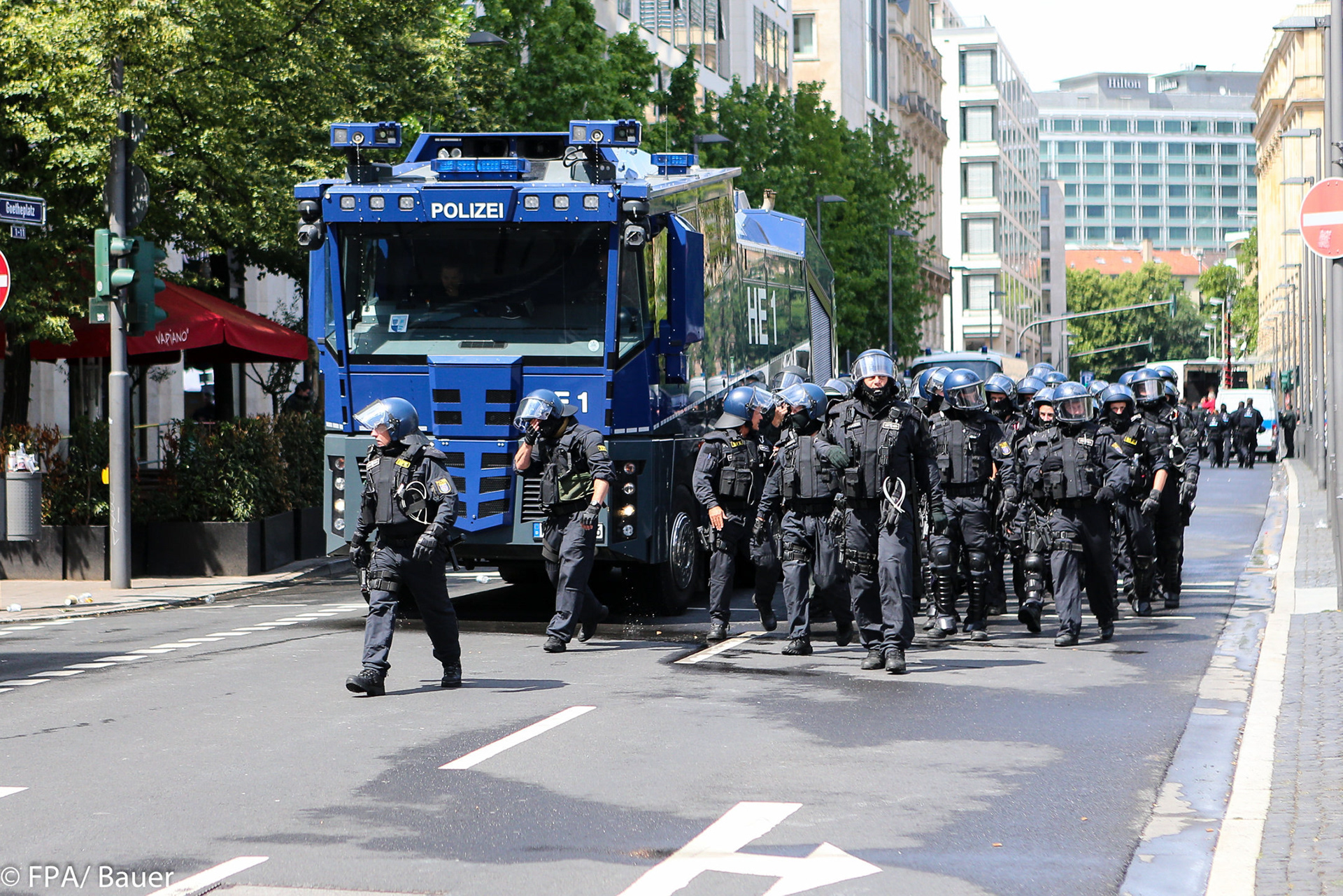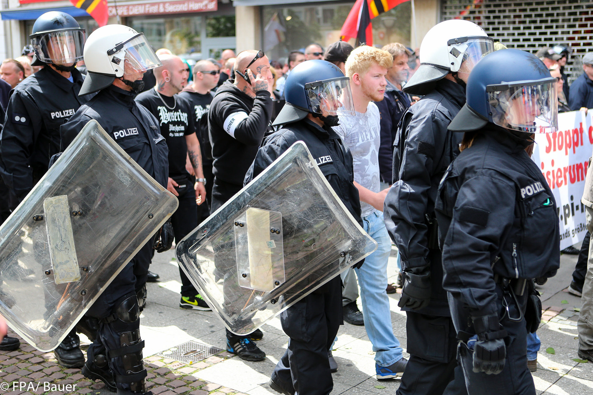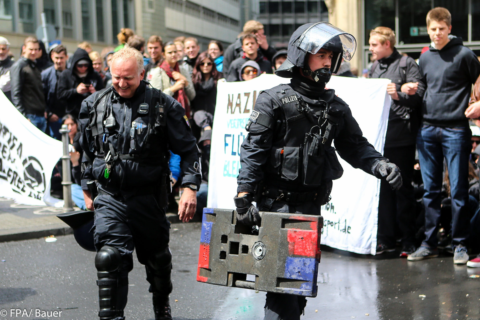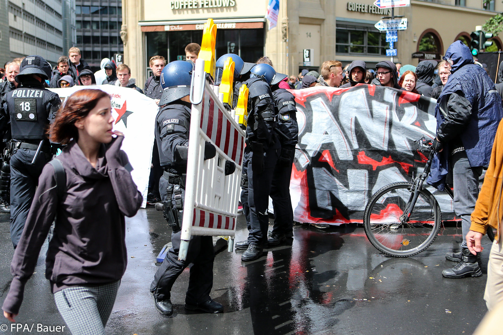 Bestimmt wurde das Bild vor allem von zahlreichen Hooligangruppen, die den Weg nach Frankfurt gefunden hatten. Beobachter erkannten die „Berserker“ aus Pforzheim und deren Ableger aus Wolfsburg. Andere Anhänger bekannten sich zu den Fußballklubs aus Dresden, Gelsenkirchen und Kaiserslautern. PI-Autor Stürzenberger fuhr ihnen um den Bart und verharmloste ihr Treiben als „fairen Sport“, später wollte er aber mögliche Sitzblockierer gerne „wegknüppeln“ lassen.